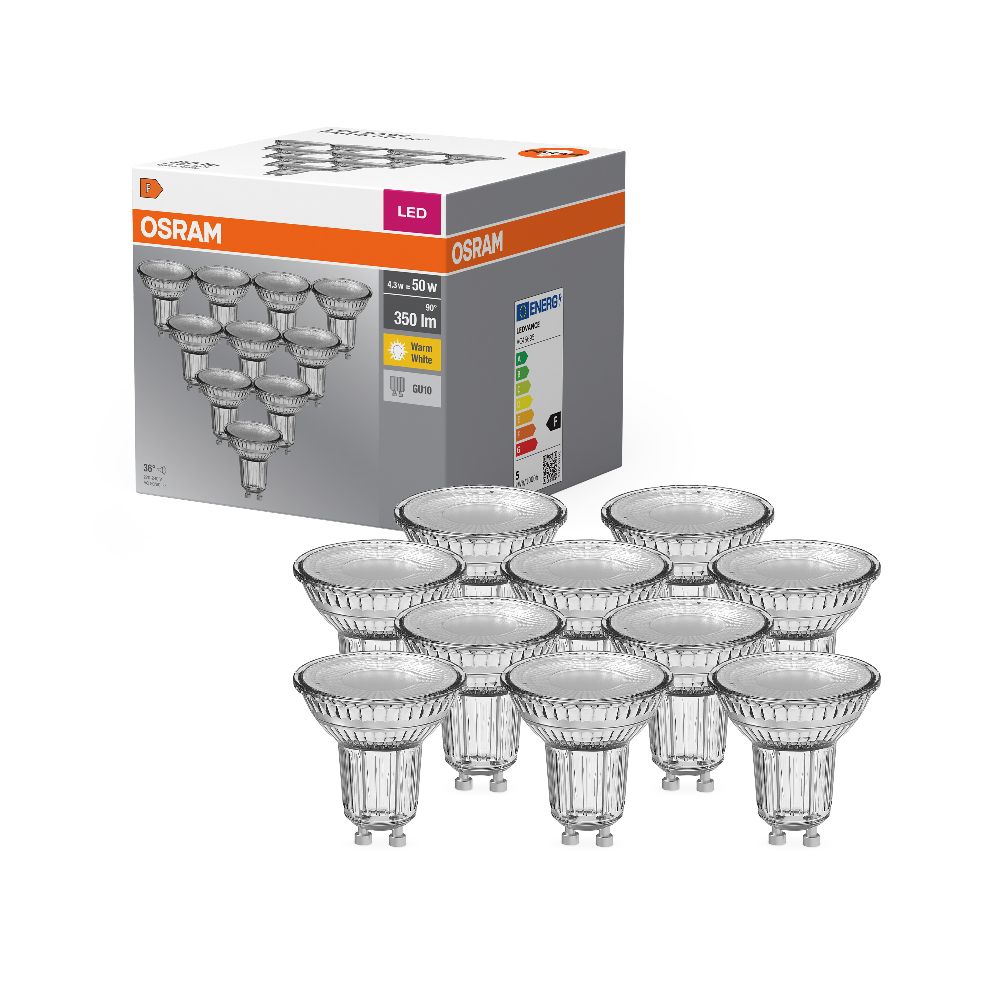 Effiziente OSRAM LED BASE PAR16 GU10 LED Strahler als 10er Set mit GU10 Fassung und 4,3W Nennleistung leuchtet mit 350Lm Lichtstrom in 2700K warmweiss.