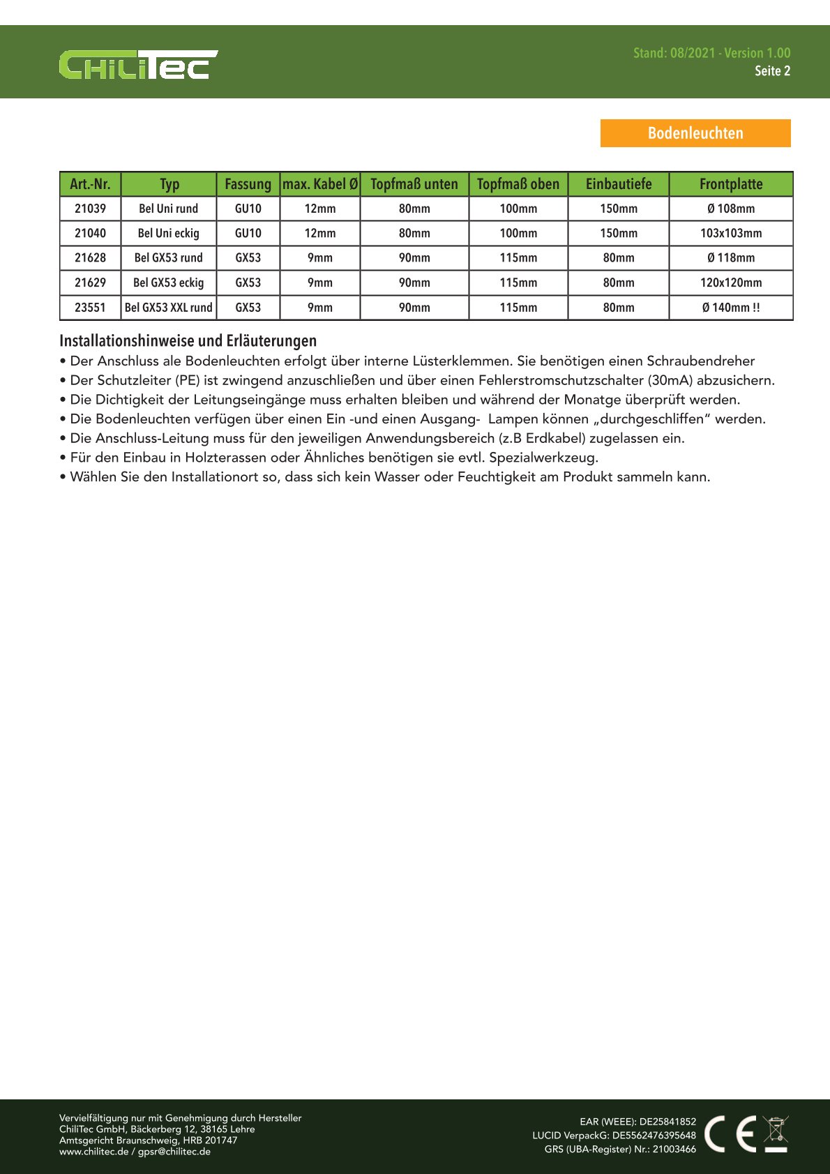 Technische Details der Bodeneinbauleuchte: