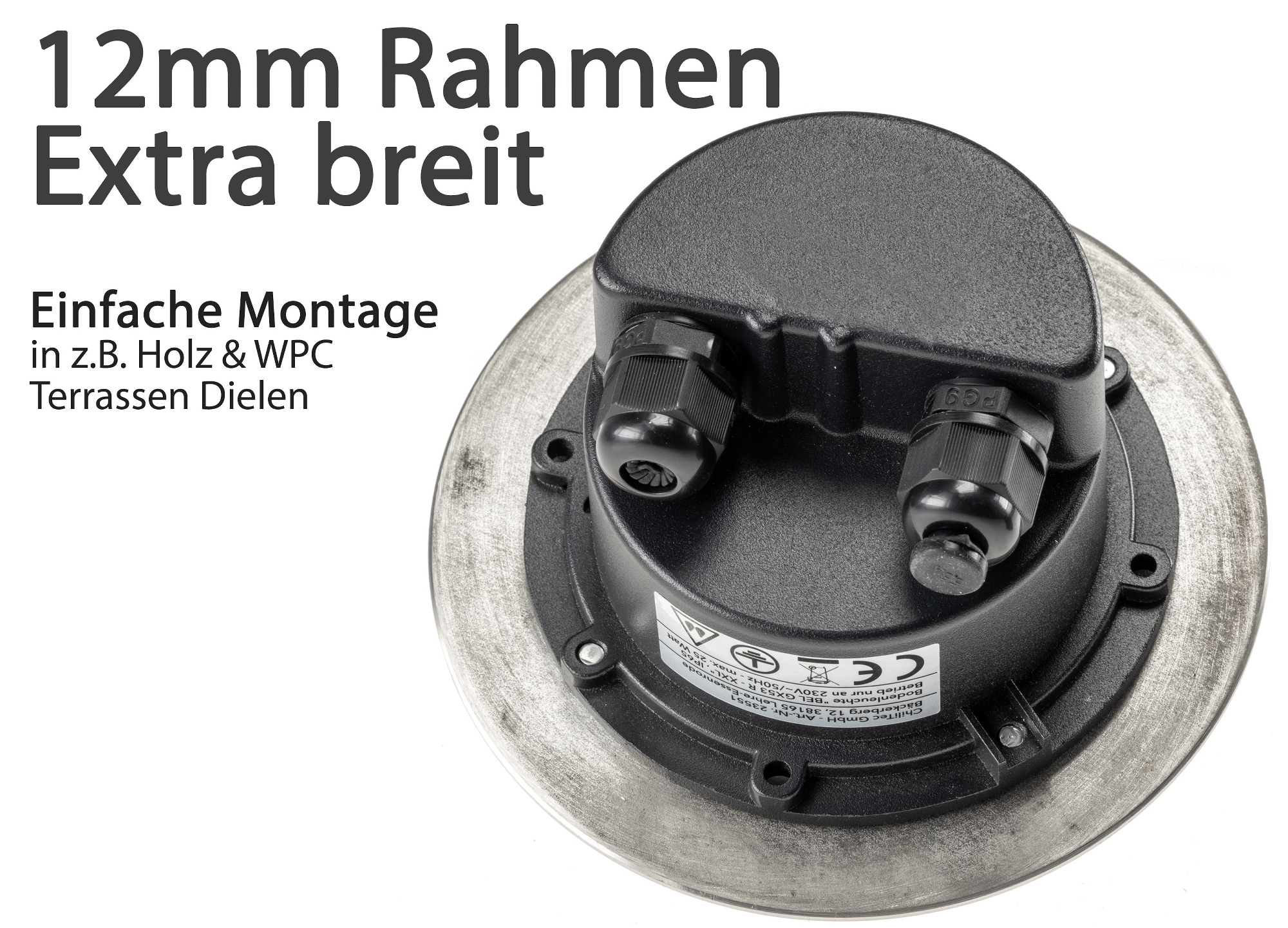 Kompakte Bodenleuchte BEL XXL ØxT 14x7cm für GX53 Leuchtmittel, incl. extrabreiter Rahmen. Bodeneinbauleuchte 23551 ist rund und mit IP65 Schutzart.