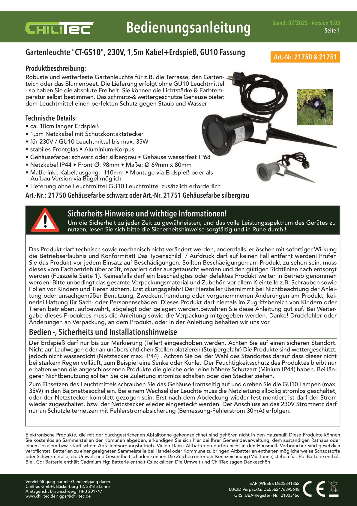 ChiliTec Gartenleuchte "CT-GS10" mit Art.-Nr. 21751 in Silbergrau ist nach IP68 Wasserfest (Netzkabel IP44) und besitzt eine GU10 Fassung (Leuchtmittel nicht enthalten) sowie Bügel + Erdspieß und 1,5m Kabel.