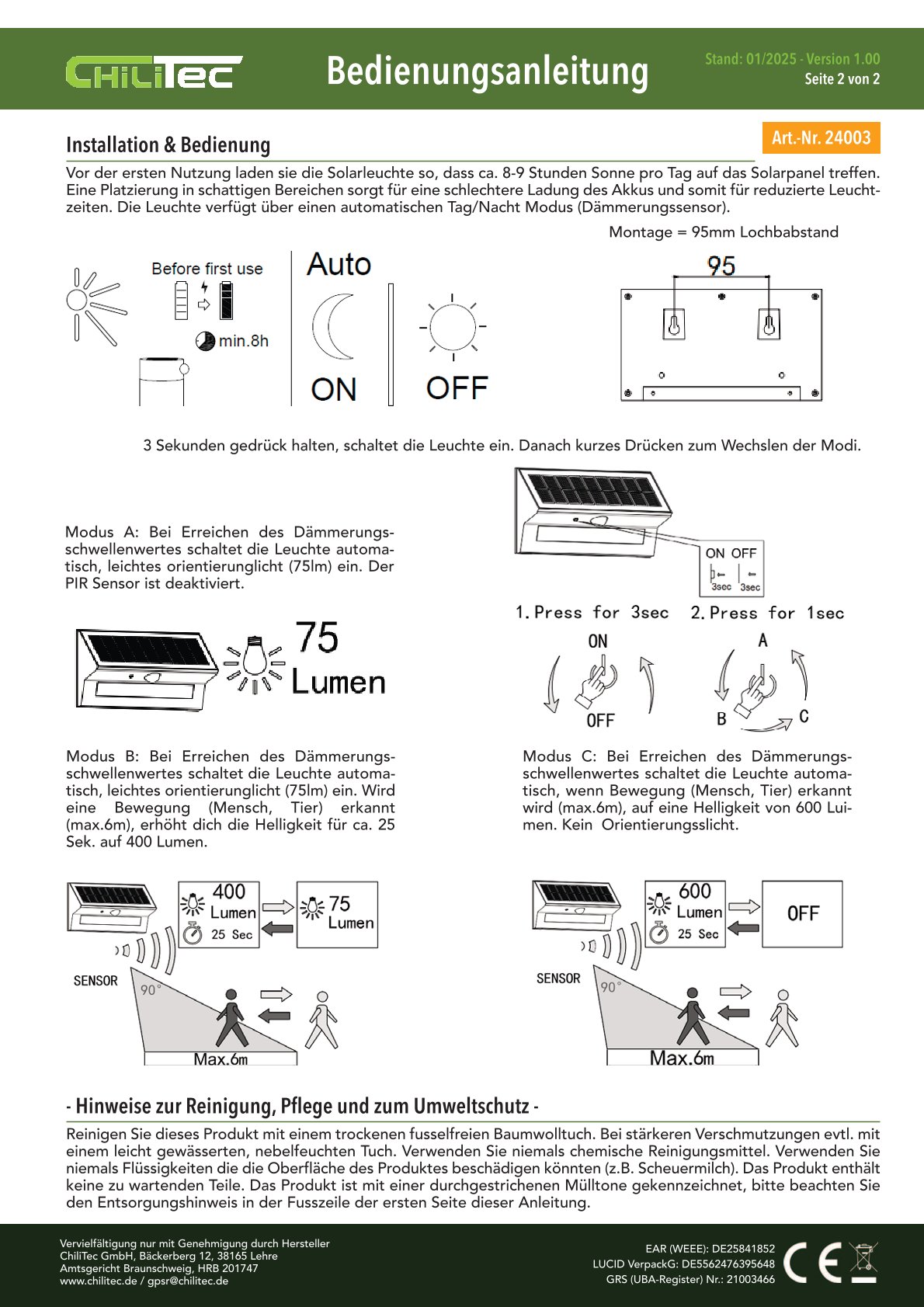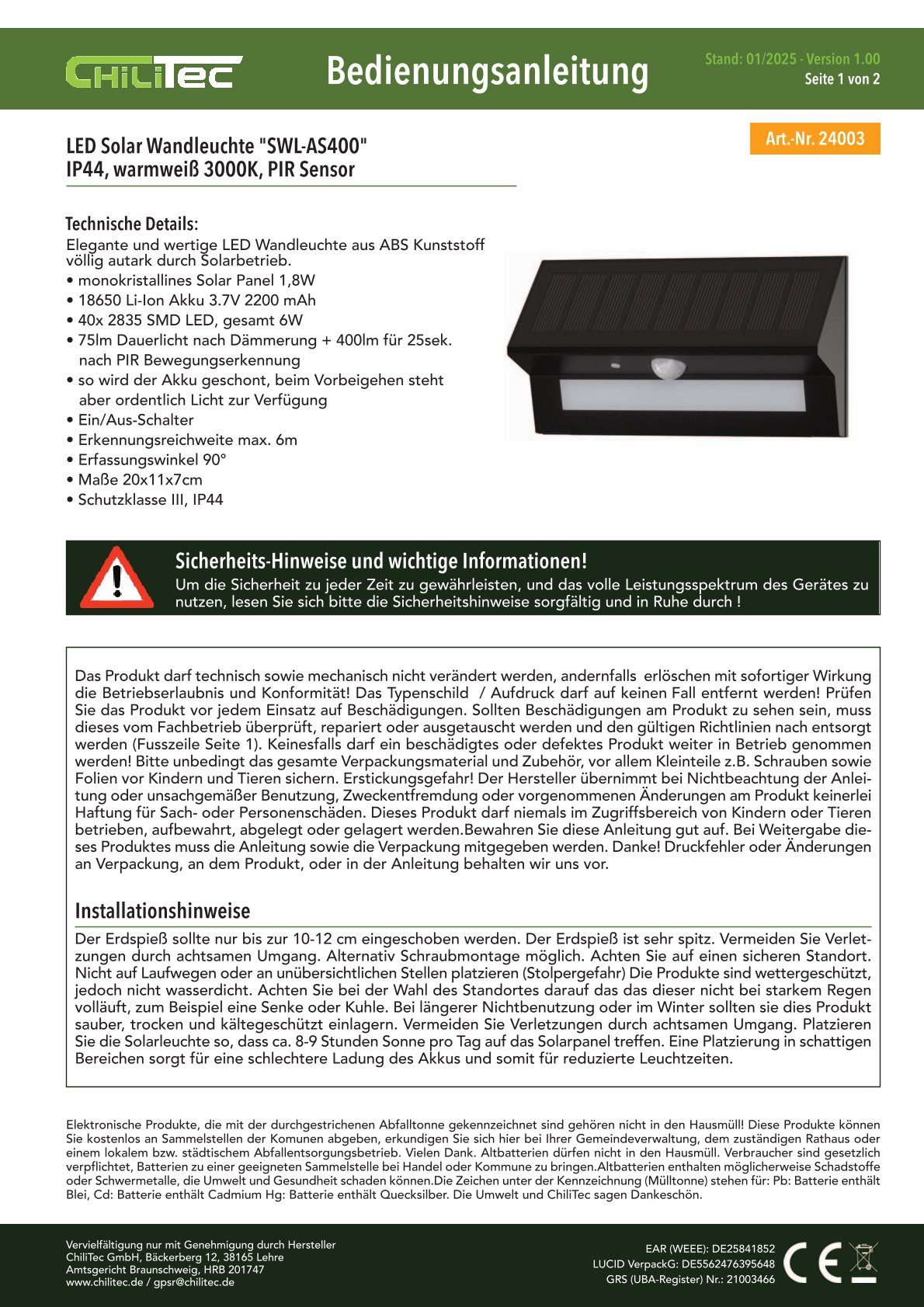 Robuste ChiliTec LED Solar Wandleuchte "SWL-AS400" mit Artikel-Nr. 24003 und IP44 Schutzart leuchtet in 3000K warmweiss (75lm Dauerlicht + 400Lm für 25sek. nach PIR Bewegungserkennung zusätzlich) und besitzt einen 90° Bewegungsmelder / PIR Sensor mit max. 8m Reichweite.