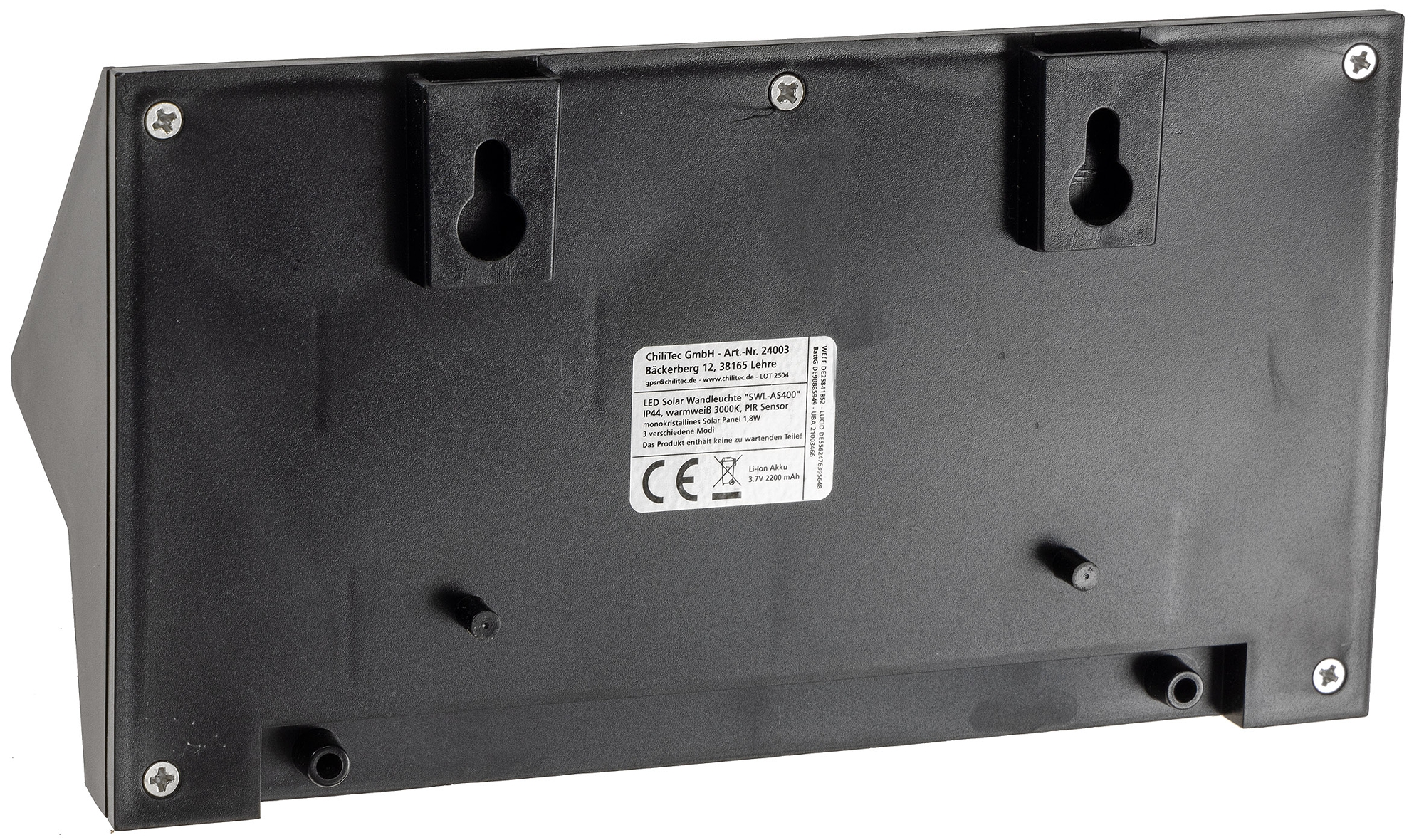 Lieferungsumfang : 1x ChiliTec LED Solar Wandleuchte "SWL-AS400" IP44 Bewegungsmelder PIR Sensor 24003