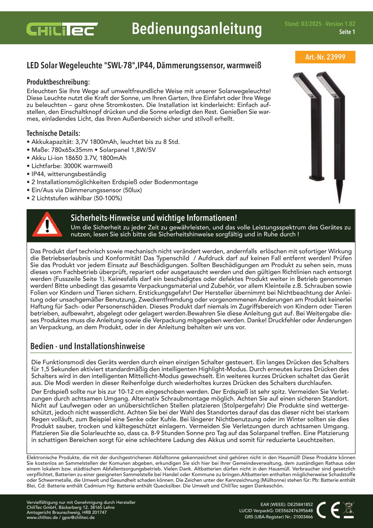 Lieferungsumfang : 1x ChiliTec LED Solar Wegeleuchte "SWL-78" 23999