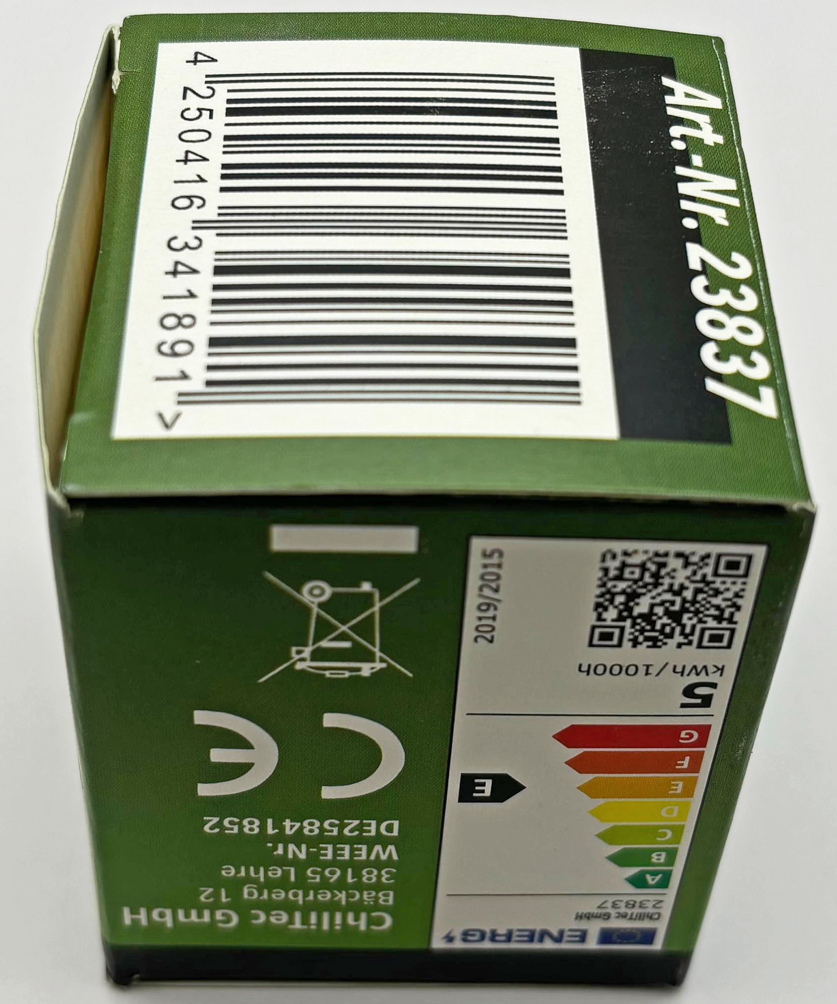 Effizienter ChiliTec LED Strahler "Glas 5W" mit Art.-Nr. 23837, GU10 Fassung, 4,8W Nennleistung strahlt 484 Lumen Lichtstrom in 3000K warmweiss mit 38° Abstrahlwinkel ab.