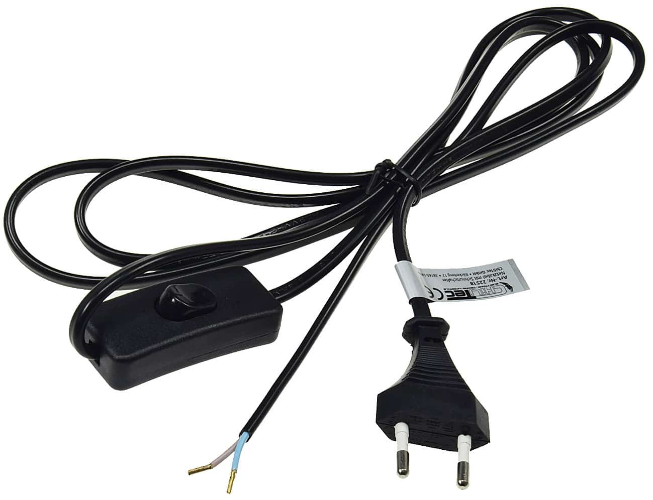 ChiliTec Netzkabel 22518 ist 2m lang in Farbe Schwarz und mit Schnurschalter sowie blanke Enden eignet sich ideal als Zubehör zum nachrüsten von Wand-/Stehleuchten.