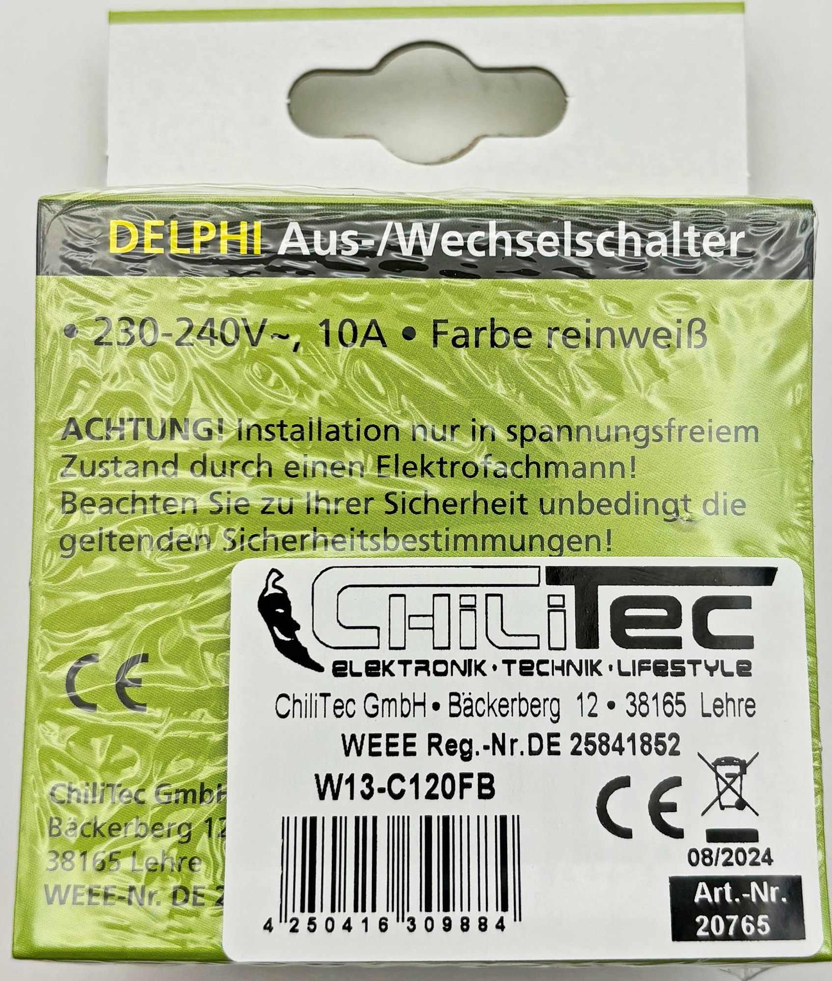 Wechselschalter UP in Farbe weiß mit Steckanschluss, Rahmen + Einsatz, aus DELPHI Serie, Art. 20765 von ChiliTec.