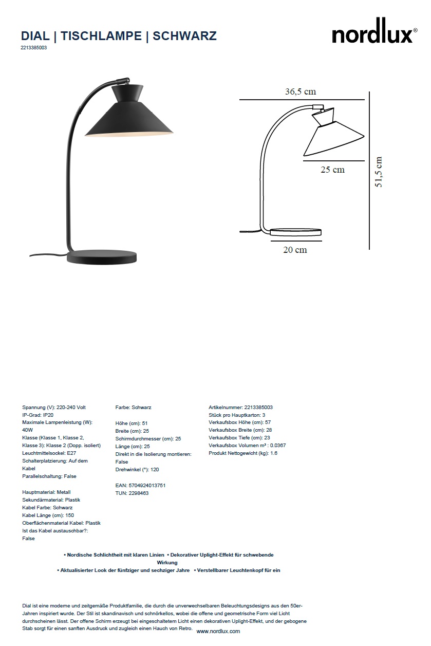 Lieferumfang : 1x Dänische Tischleuchte Dial, schwarz, ohne Leuchtmittel. Bitte bestellen Sie sich eine sparsame E27 LED-Lampe gleich mit!