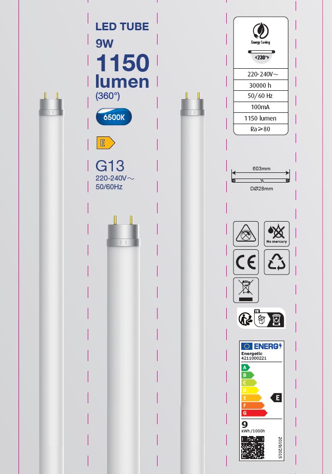 Energetic 9W LED Röhre 60cm T8 G13F (Glasröhre mit Schutzfolie) mit Art. 4211000221 - helles Leuchtmittel in Glas Frosted erzeugt 1150Lm Lichtsrom in 6500K kaltweiss.
