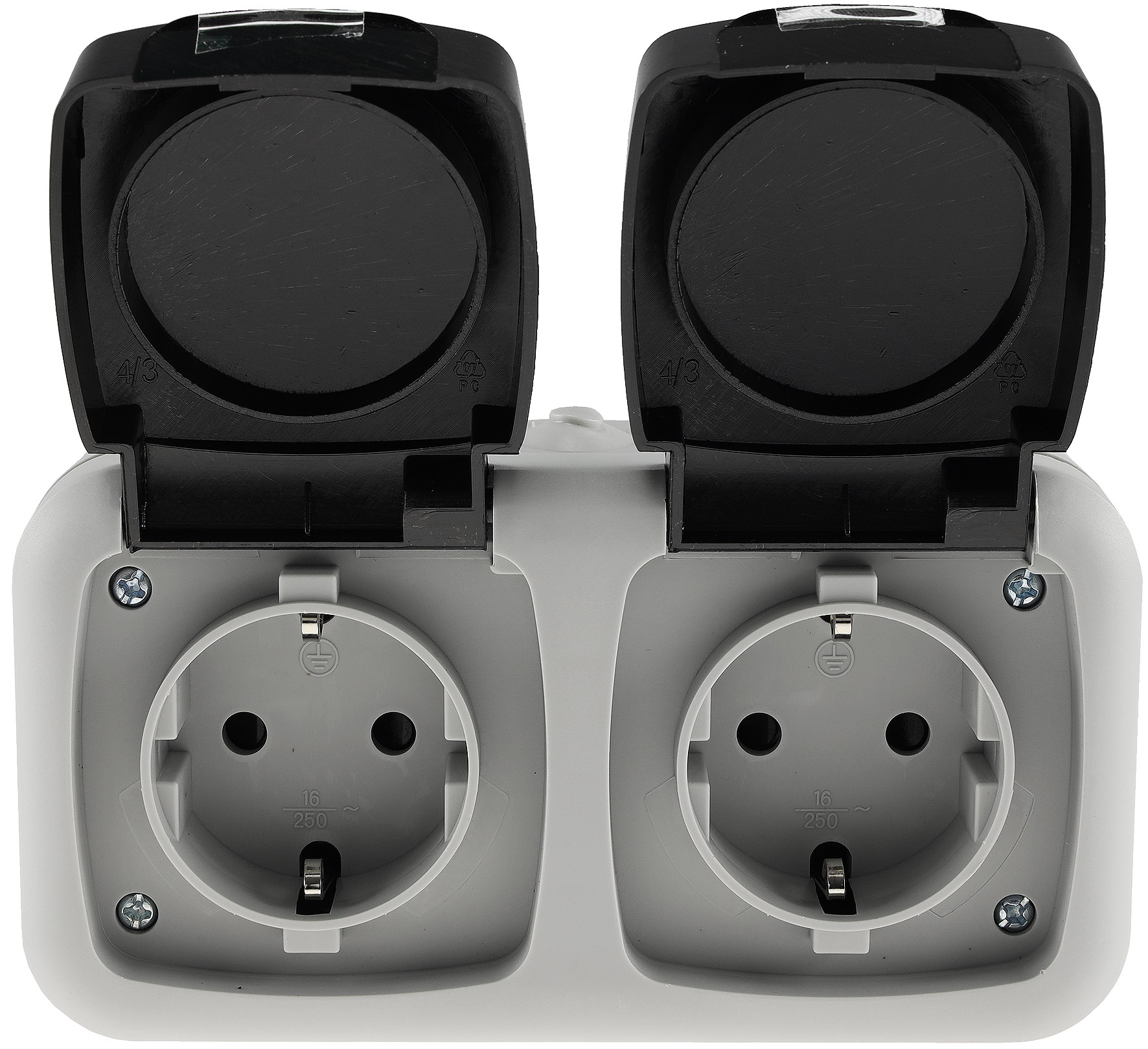 Kombi Doppel-Steckdose mit Deckel 20469 mit IP44 Schutzart von ChiliTec ist für die Installation in den Feuchträume bestens geeeignet. Korpusfarbe in grau .
