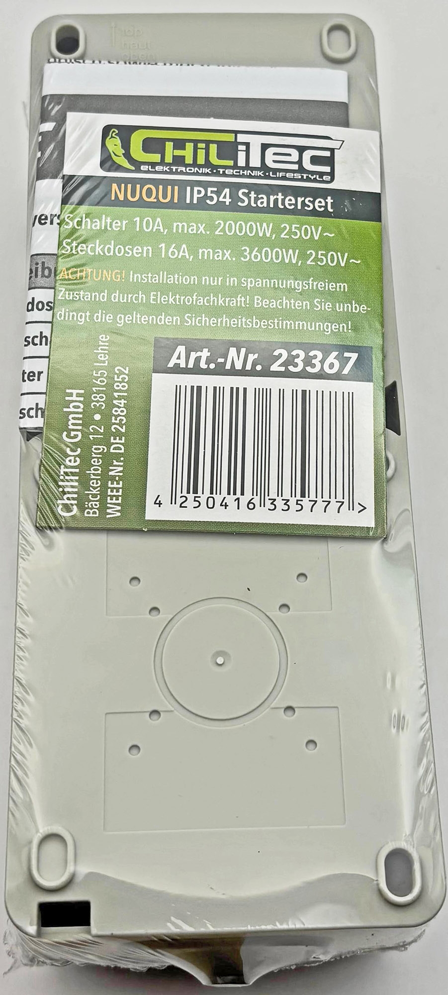 NUQUI-Serie für Feuchtraum - Steckdose mit Wechsel-Schalter mit IP54 Schutzart für Aufputz Montage als Vertikal von ChiliTec mit Art. 23367.