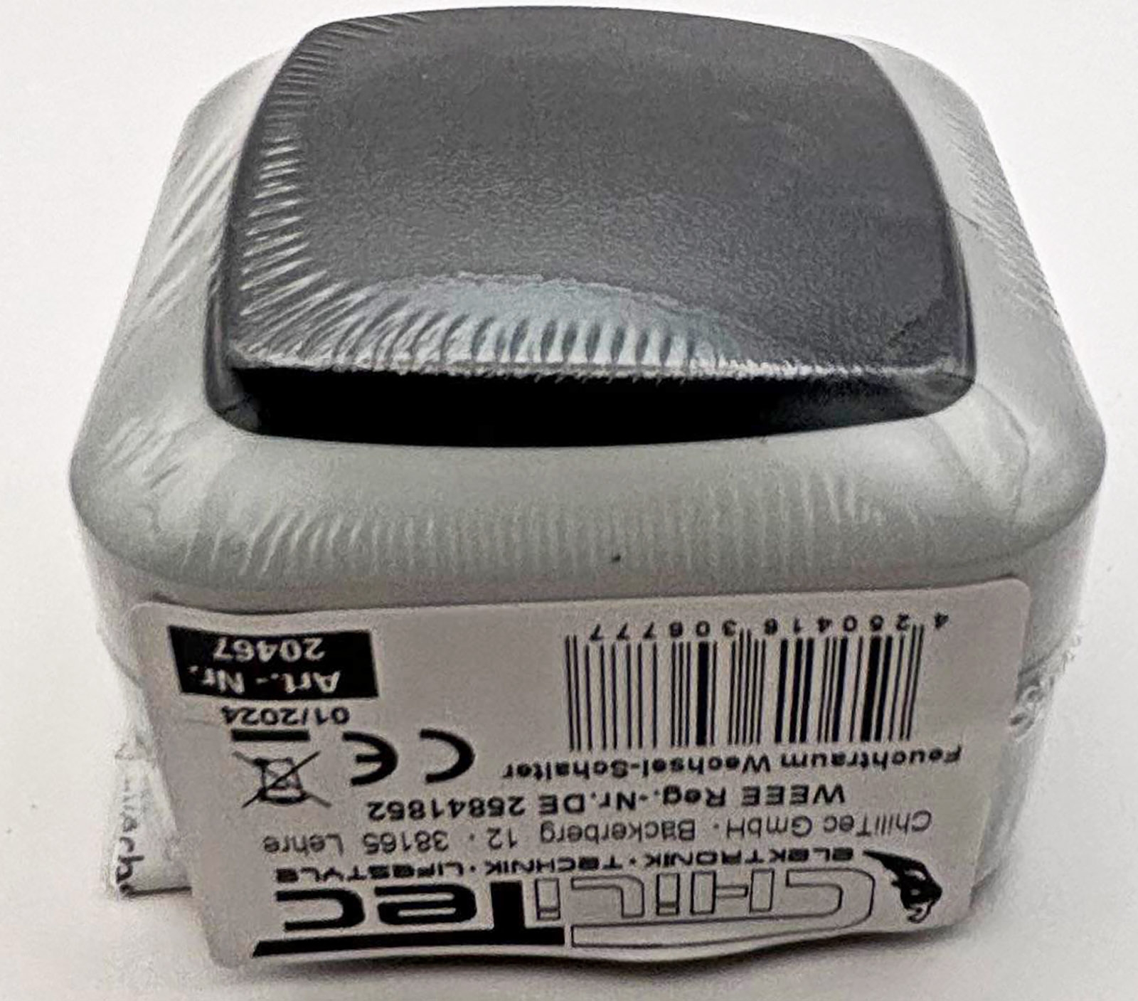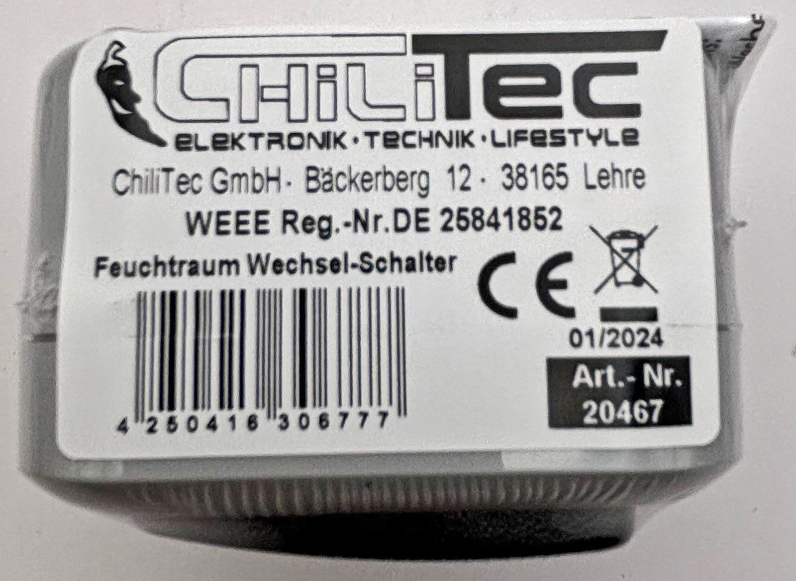 Wechselschalter mit Art.-Nr 20467 mit IP44 Schutzart ist für die Installation in den Feuchträume geeignet, Farbe in grau von ChiliTec.
