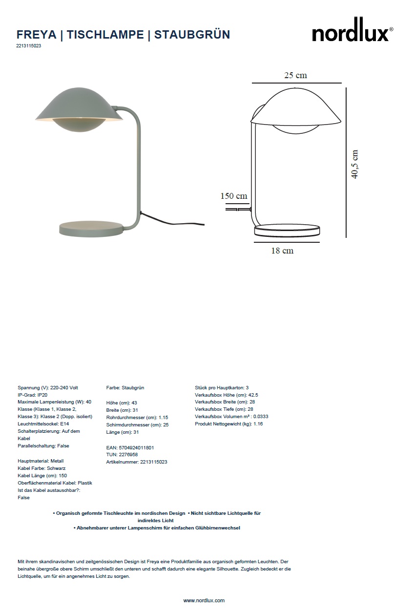 Lieferumfang : 1x Tischlampe Freya, grün, ohne Leuchtmittel. Bestellen Sie sich doch eine passende und sparsame E14 LED-Lampe gleich mit!