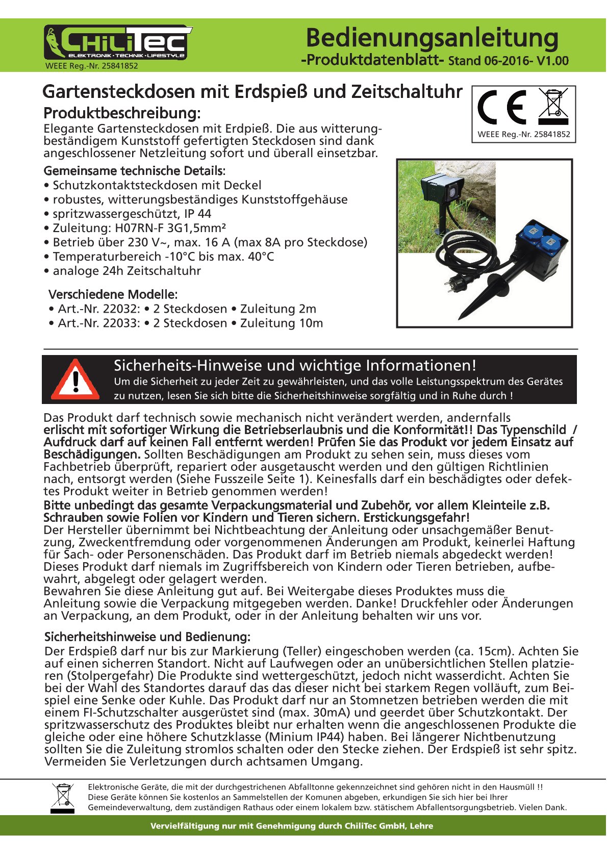 ChiliTec 2-fach Gartensteckdose 22032 mit Zeitschaltuhr + Erdspieß und 2m Zuleitung ist IP44 spritzwassergeschützt, Leistung : max. 3680 Watt.