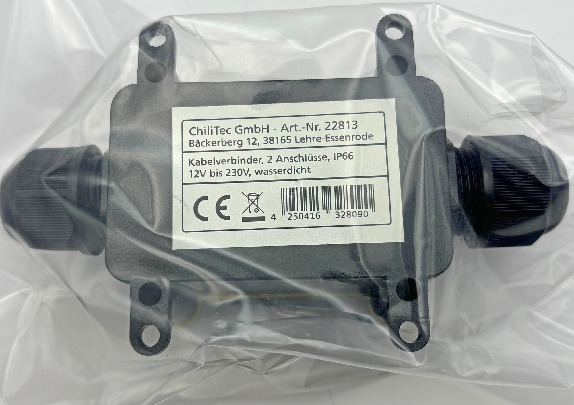 Lieferumfang : 1x ChiliTec Kabelverbinderbox für 2 Anschlüsse IP68, 1x Eingang, 1x Ausgang, 22813