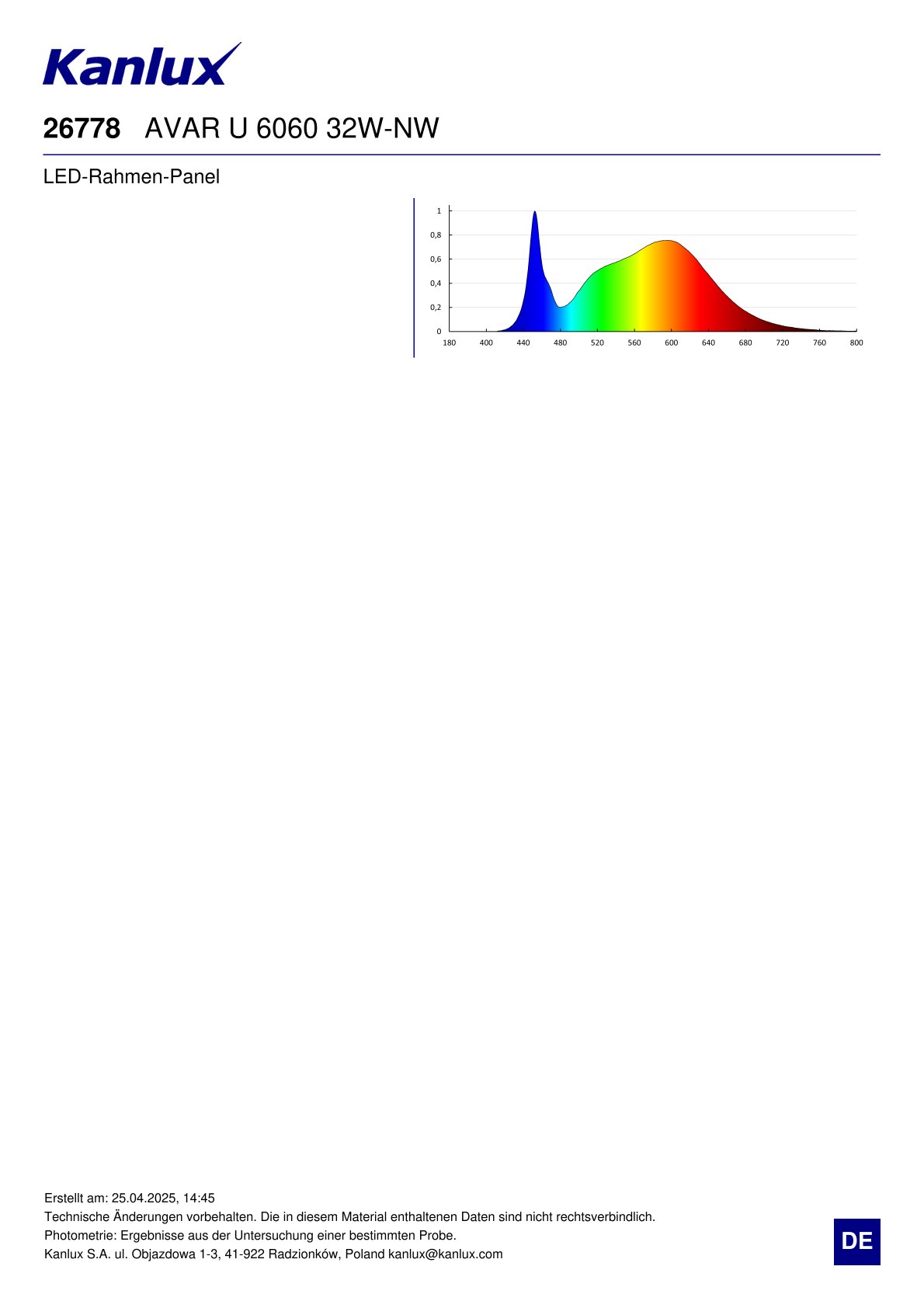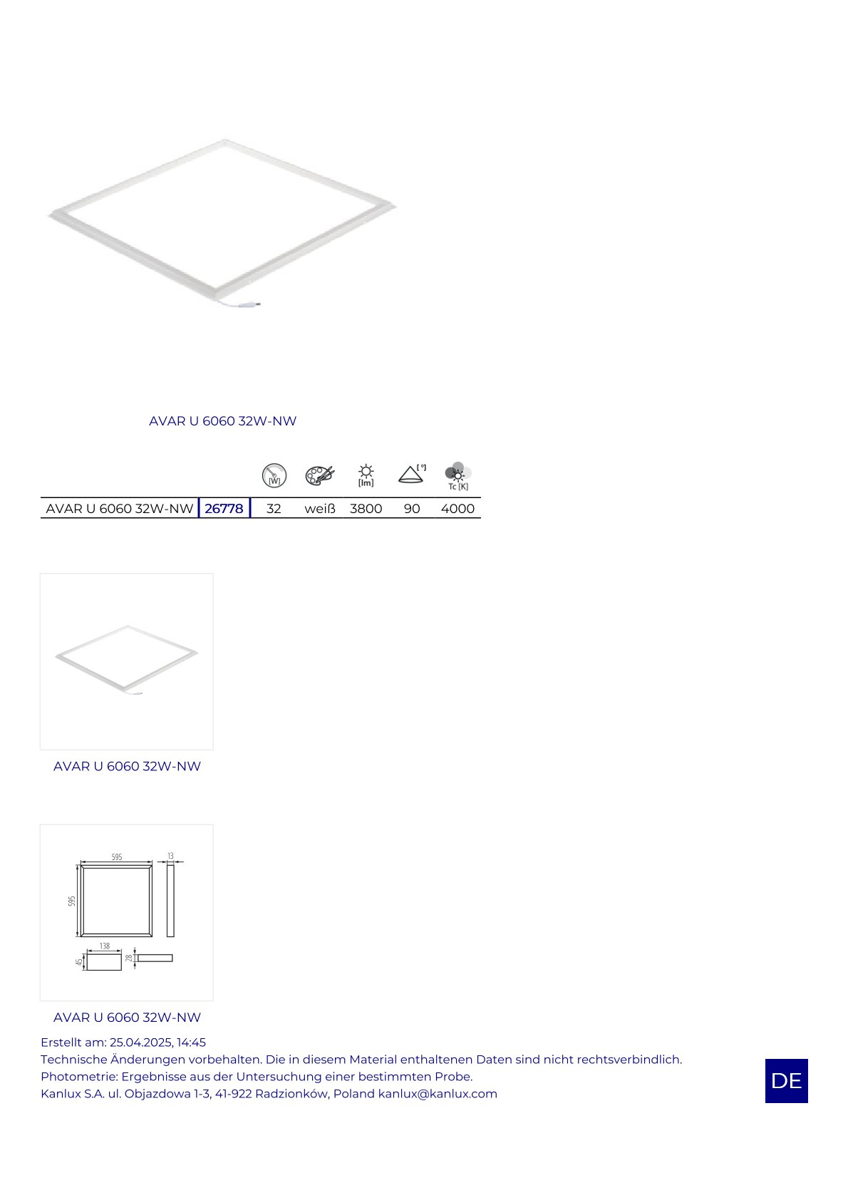 Energieeffiziente und moderne Kanlux LED-Rahmen-Panel AVAR U 6060 in eckiger Bauform leuchtet mit max 32 Watt Leistung in 4000K neutralweiss mit 3800Lm. Sie können LED Lichtrahmen / Einbauleuchte mit Art.-Nr. 26778, geringer Blendung UGR<19 und sehr hoher 119 lm/W Lichtausbeute nicht nur als effiziente Bürobeleuchtung, sondern auch gleichzeitig als Dekoration für die Gewerbebeleuchtung nutzen.