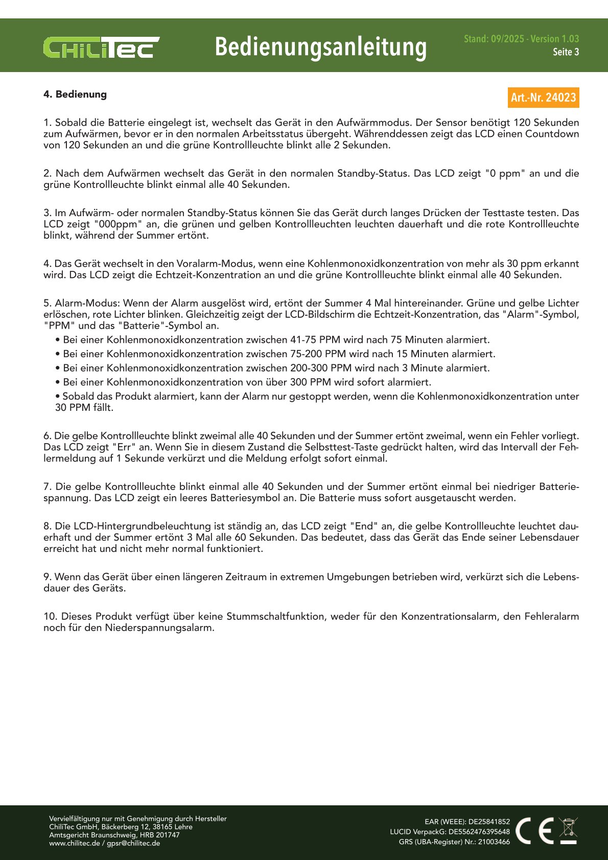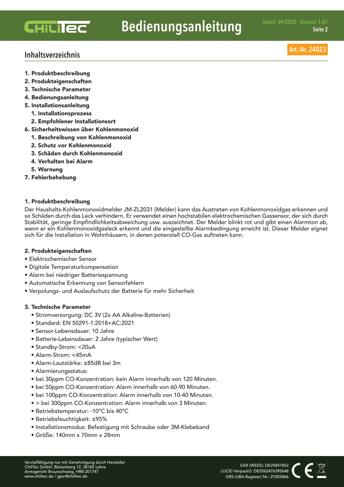 Lieferumfang : 1x Kohlenmonoxid Melder "CT-KM 25" 24023