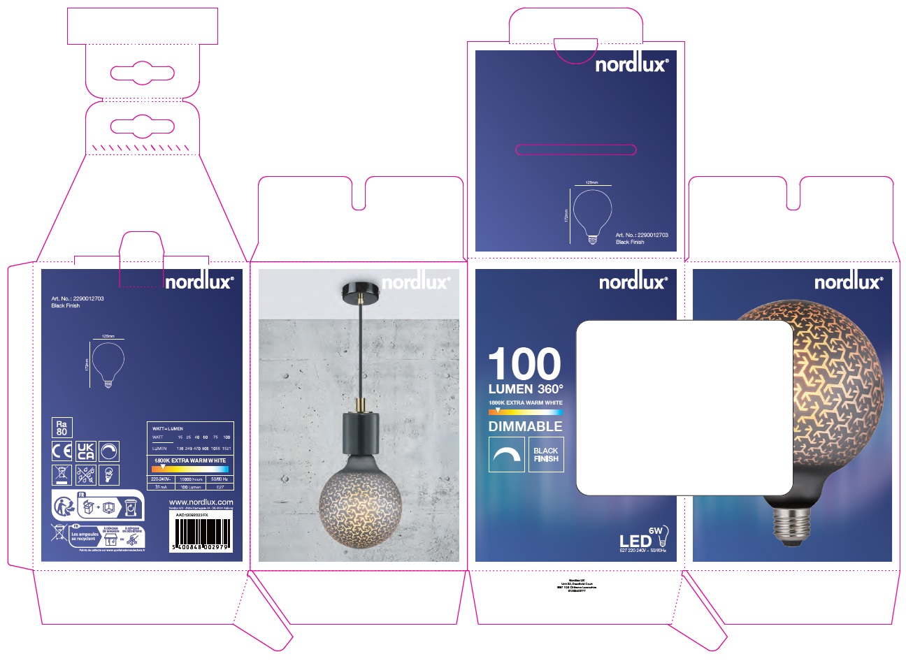 Elegante 6W Filament LED Lampe Deco mit E27 Fassung und Artikelnummer 2290012703, G125 Pattern Dim von Nordlux ist dimmbar und leuchtet extra warmweiss mit 1800 Kelvin und 100Lm Lichtstrom.