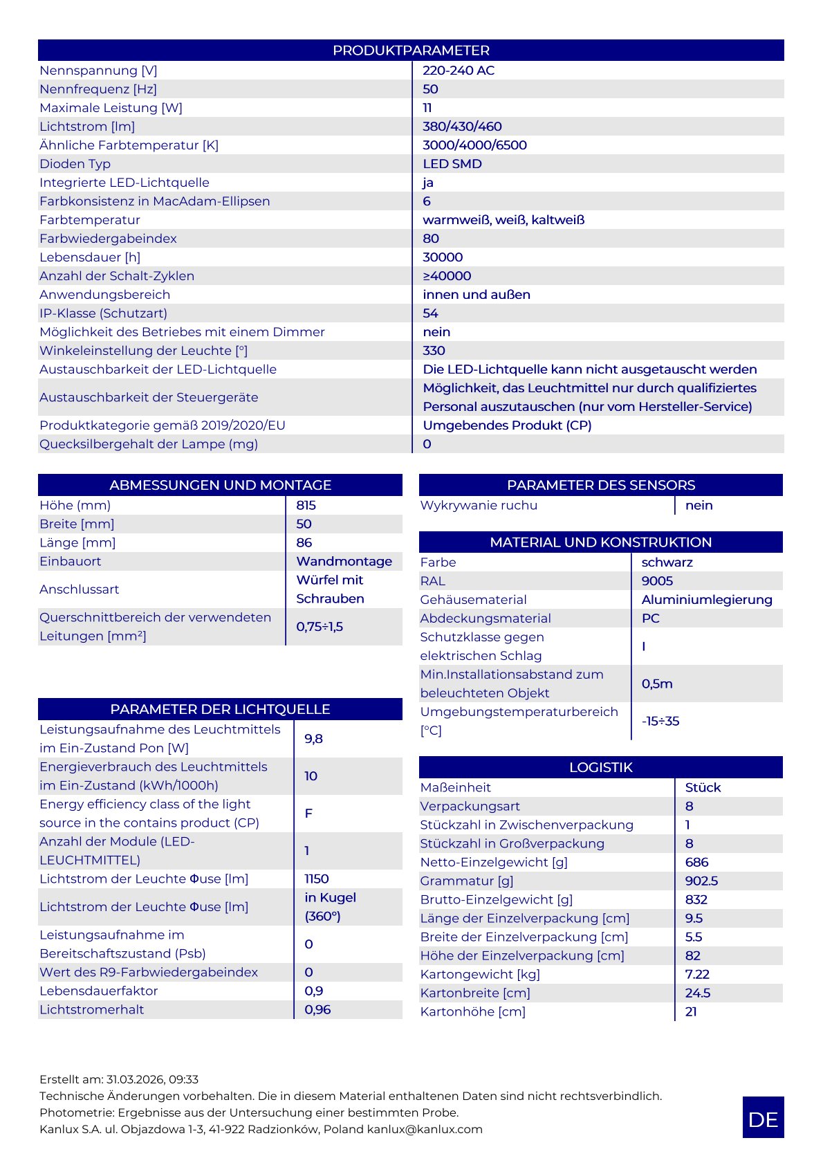 Angaben gem. Hersteller EU-Produktsicherheitsrichtlinie: Kanlux GmbH / IDEAL, Flugplatz 21, 44319 Dortmund, kanlux@kanlux.com