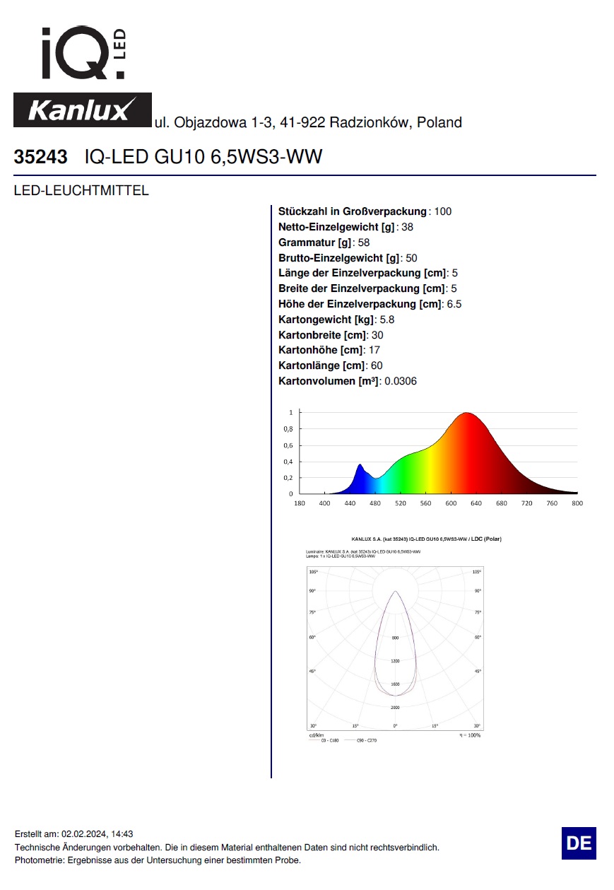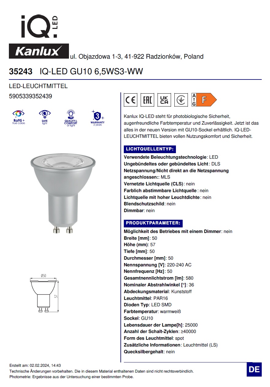 Angaben gem. Hersteller EU-Produktsicherheitsrichtlinie: Kanlux GmbH / IDEAL, Flugplatz 21, 44319 Dortmund, kanlux@kanlux.com