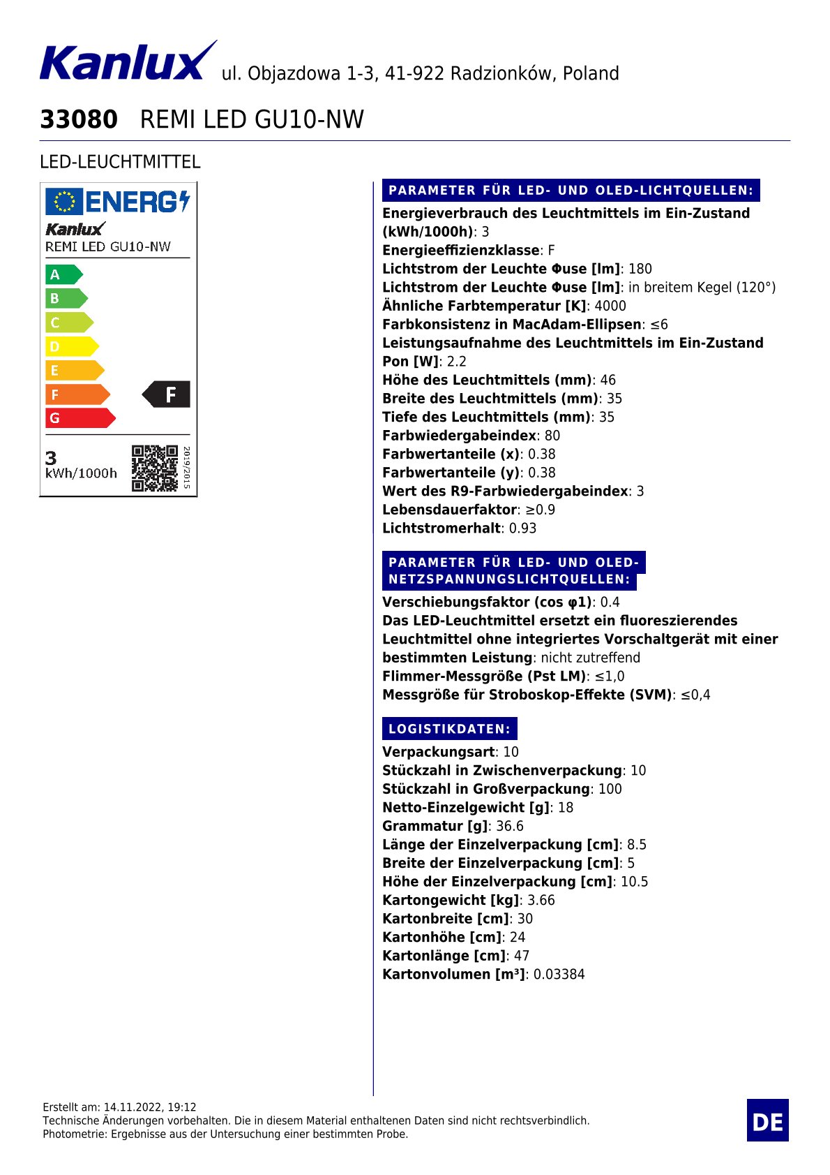 Angaben gem. Hersteller EU-Produktsicherheitsrichtlinie: Kanlux GmbH / IDEAL, Flugplatz 21, 44319 Dortmund, kanlux@kanlux.com
