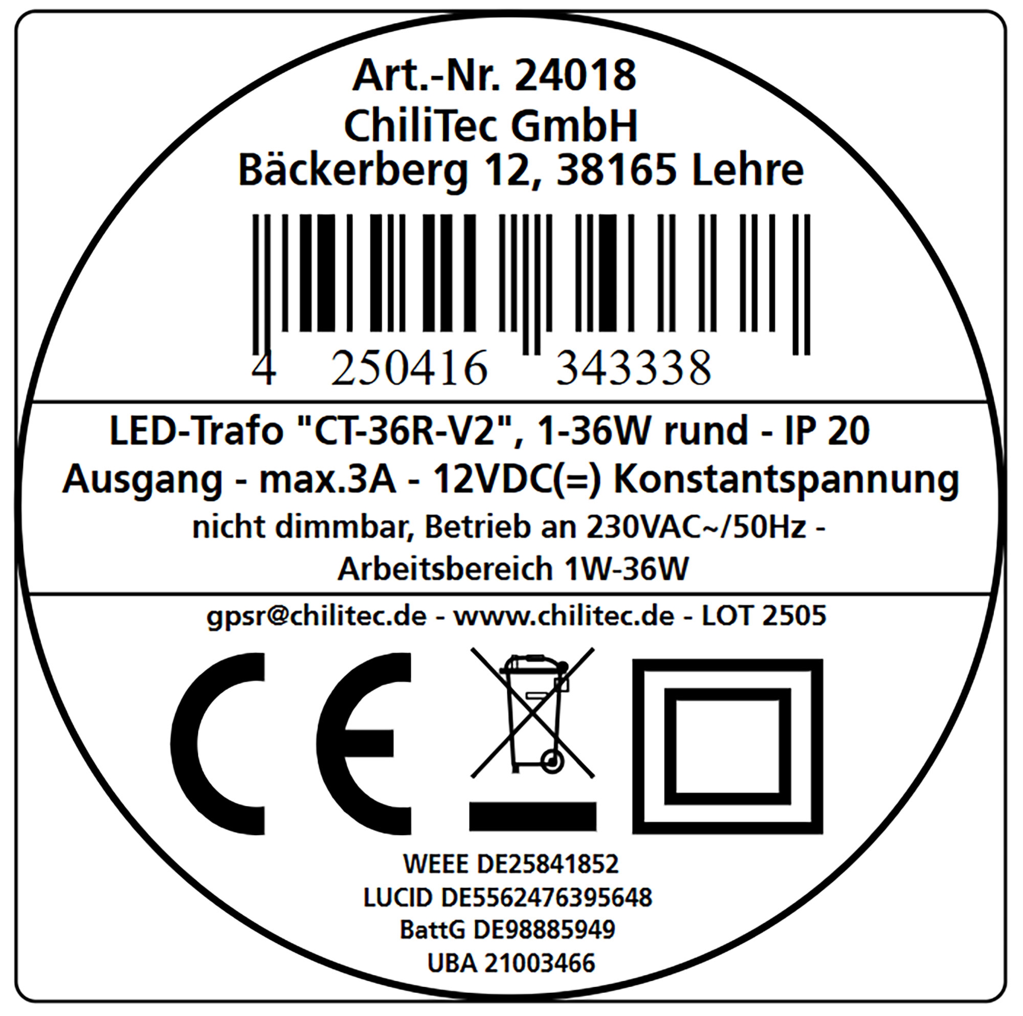 Kompakter LED Trafo 24018 von ChiliTec - Elektronischer CT-36E 0,5-36W - ideal für den Betrieb von LED Wandeinbauleuchten.