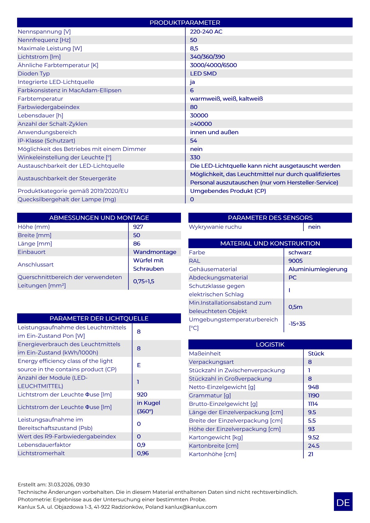 Angaben gem. Hersteller EU-Produktsicherheitsrichtlinie: Kanlux GmbH / IDEAL, Flugplatz 21, 44319 Dortmund, kanlux@kanlux.com