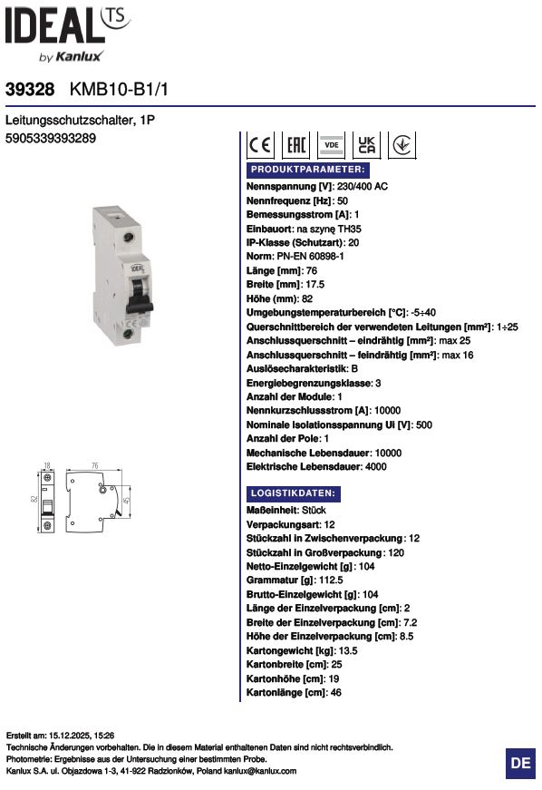Sicherung mit VDE - Zeichen für eine sichere Elektroinstallation - Leitungsschutzschalter aus KMB10 Serie von Ideal - Sicherungsautomat 39328 by Kanlux - B1 1P, Schutzschalter mit Leistung 1A.