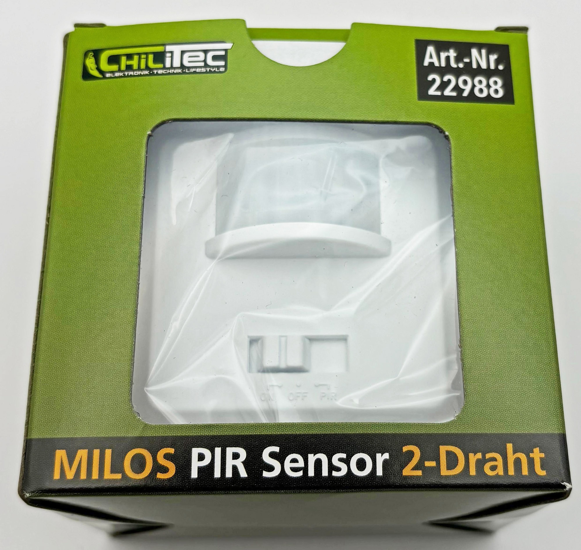 2-Draht MILOS Bewegungsmelder mit Art.-Nr. 22988 in Farbe weiß matt mit PIR Sensor, 160° Erfassungswinkel ist für LED sowie für UP / Unterputz Elektrointallation geeignet.