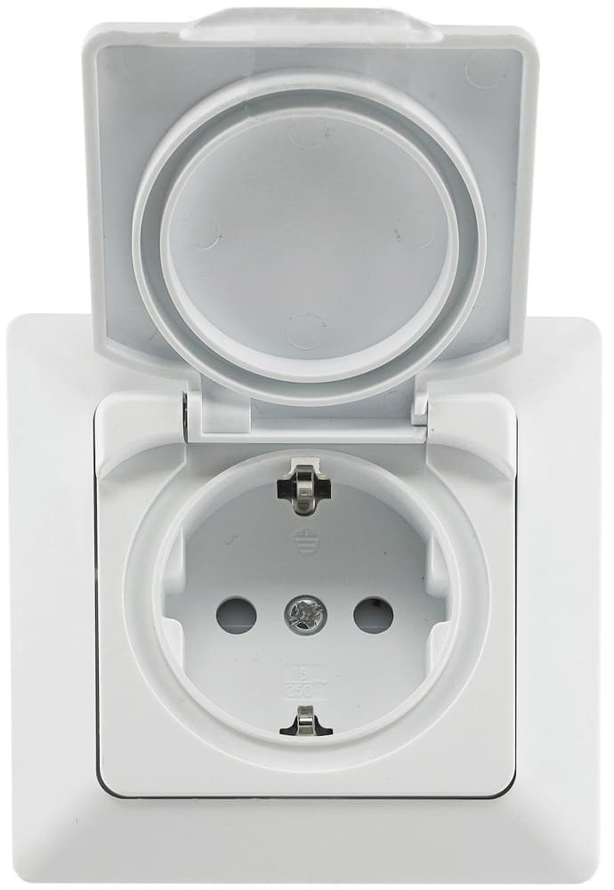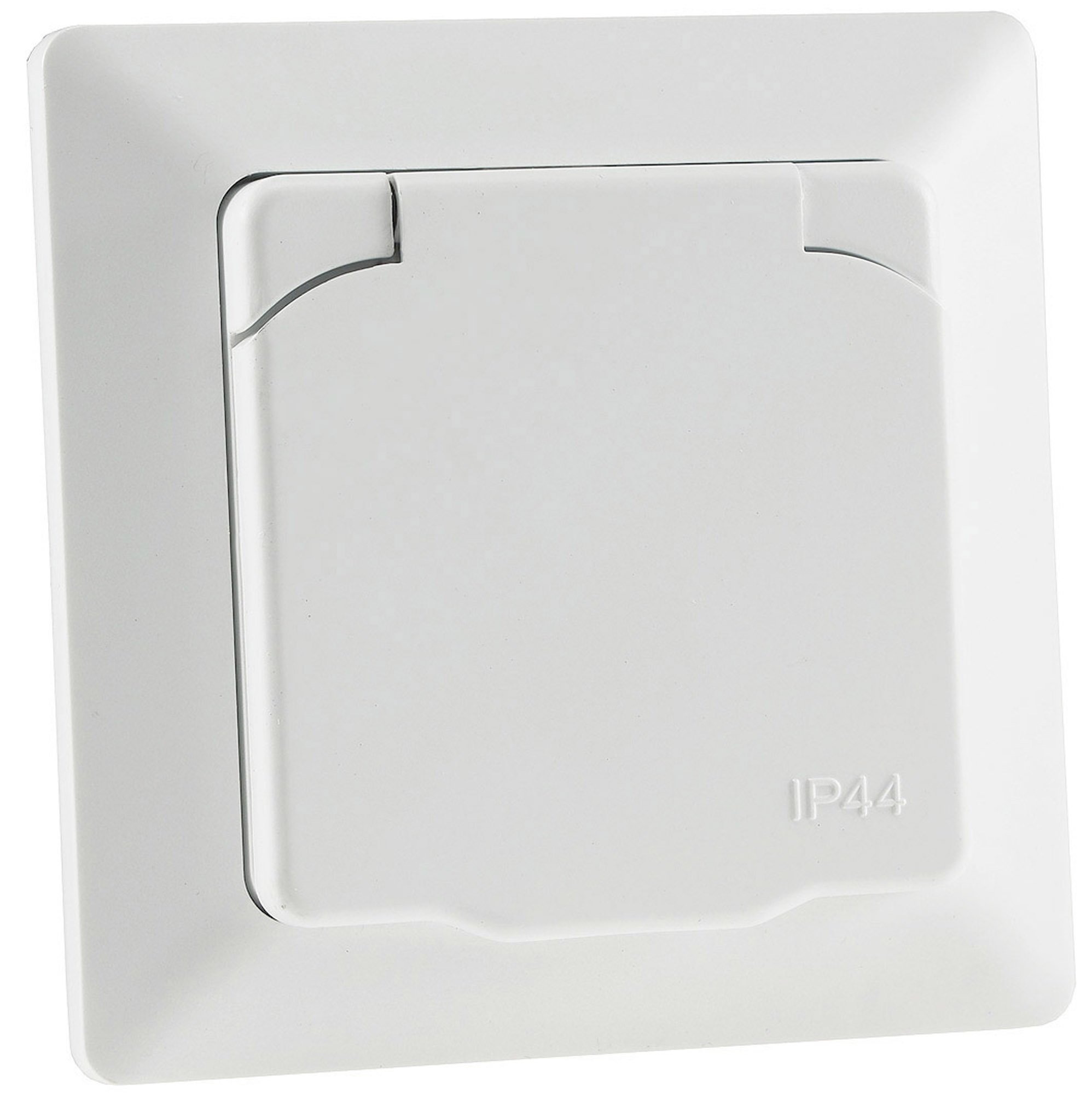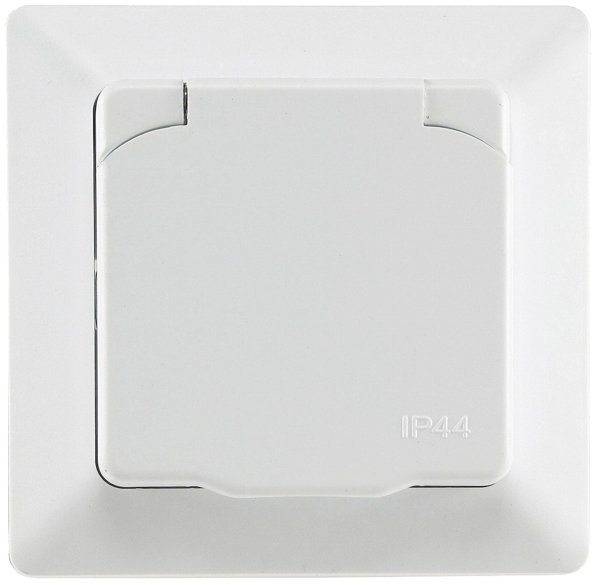 ChiliTec MILOS Steckdose Artikel-Nr. 22785 mit Deckel, IP44 Schutzart und mit erhöhtem Berührungsschutz (Einstecksicherung) aus MILOS Serie in Farbe Matt Weiß mit Schutzkontakt, Rahmen und Schraubanschluss, Einsatz und Rahmen.