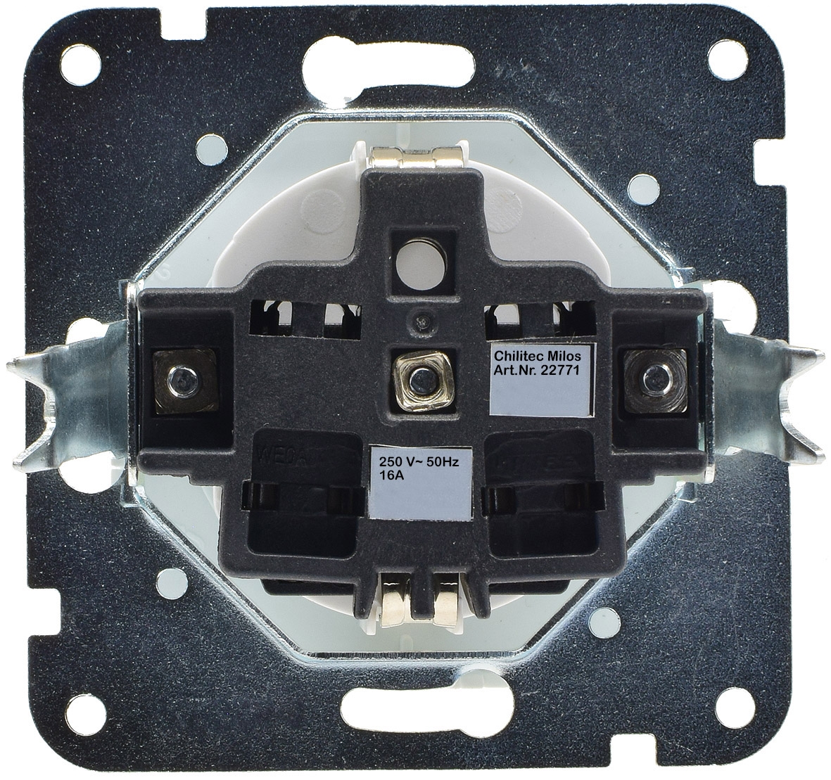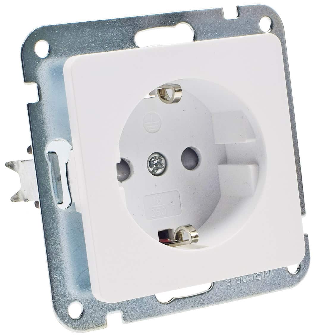 MILOS Steckdose als Einsatz-Modul, ohne Rahmen mit Art.-Nummer 22771 und erhöhtem Berührungsschutz (Einstecksicherung) aus MILOS Serie in Farbe Matt Weiß mit Schutzkontakt und Klemmanschluss.