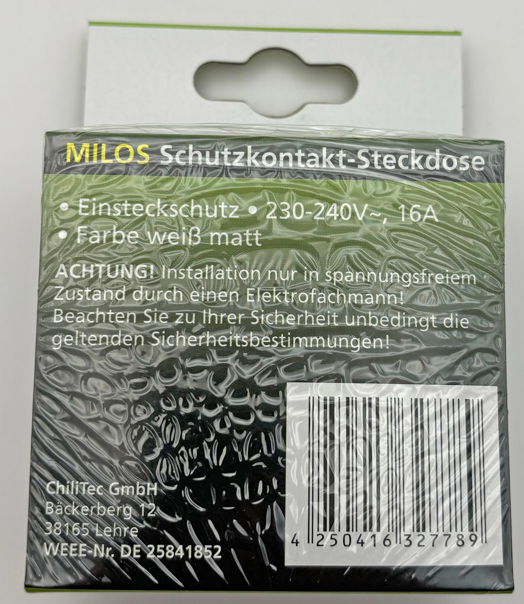 ChiliTec MILOS Steckdose mit Art.-Nr. 22770 und mit erhöhtem Berührungsschutz (Einstecksicherung) aus MILOS Serie in Farbe Matt Weiß mit Schutzkontakt, Rahmen und Klemmanschluss, Einsatz und Rahmen.