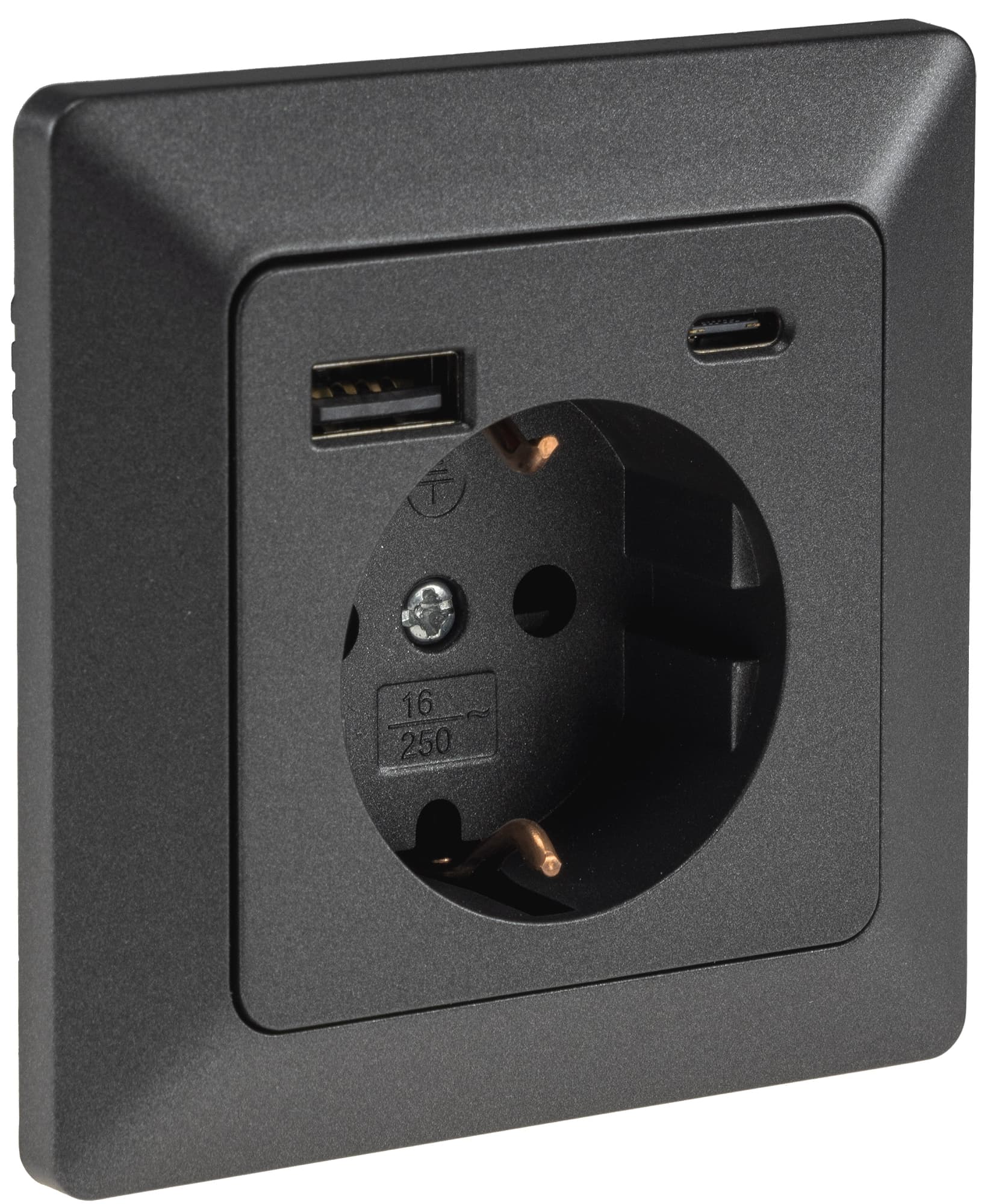 UP MILOS Steckdose 24036 in Farbe anthrazit incl. Schutzkontakt von ChiliTec mit zwei USB-Buchsen - USB-A + USB-C / PD 3.0 .