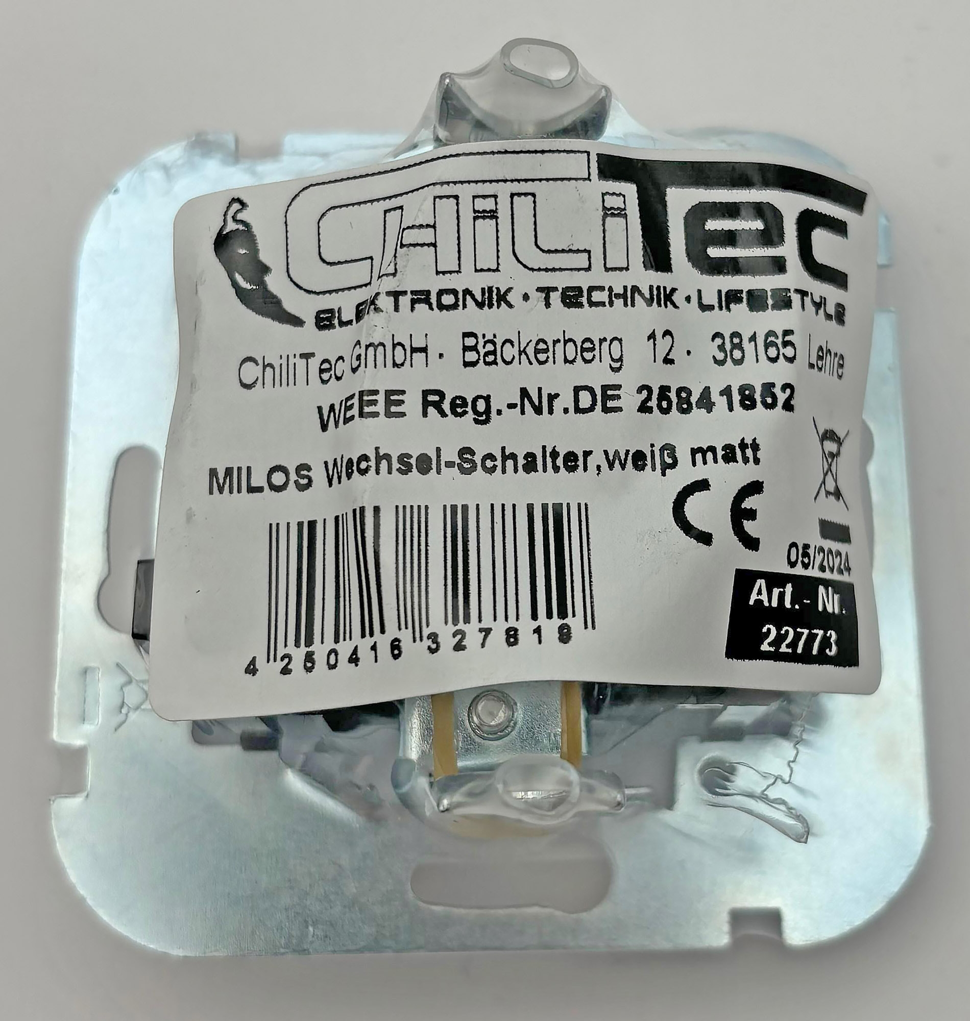 Einsatz-Modul Ohne Rahmen - ChiliTec Wechselschalter mit Art.-Nr. 22773 ohne Rahmen aus MILOS Schalter-Serie in Farbe Matt Weiß mit Klemmanschluss.