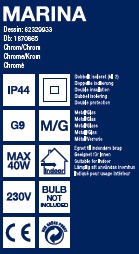 Lieferumfang : 1x Wandleuchte Marina, chrome, ohne Leuchtmittel. Eine passende G9 LED-Lampe können Sie gleich mitbestellen.