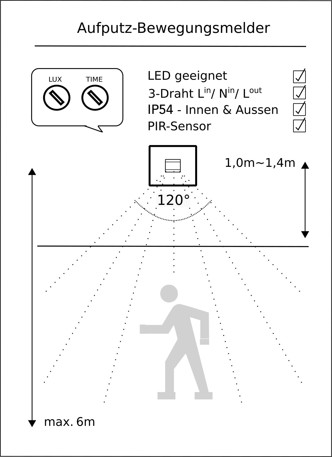 NUQUI Feuchtraum PIR Bewegungsmelder IP54, 120°, 2-500W, ChiliTec 23468