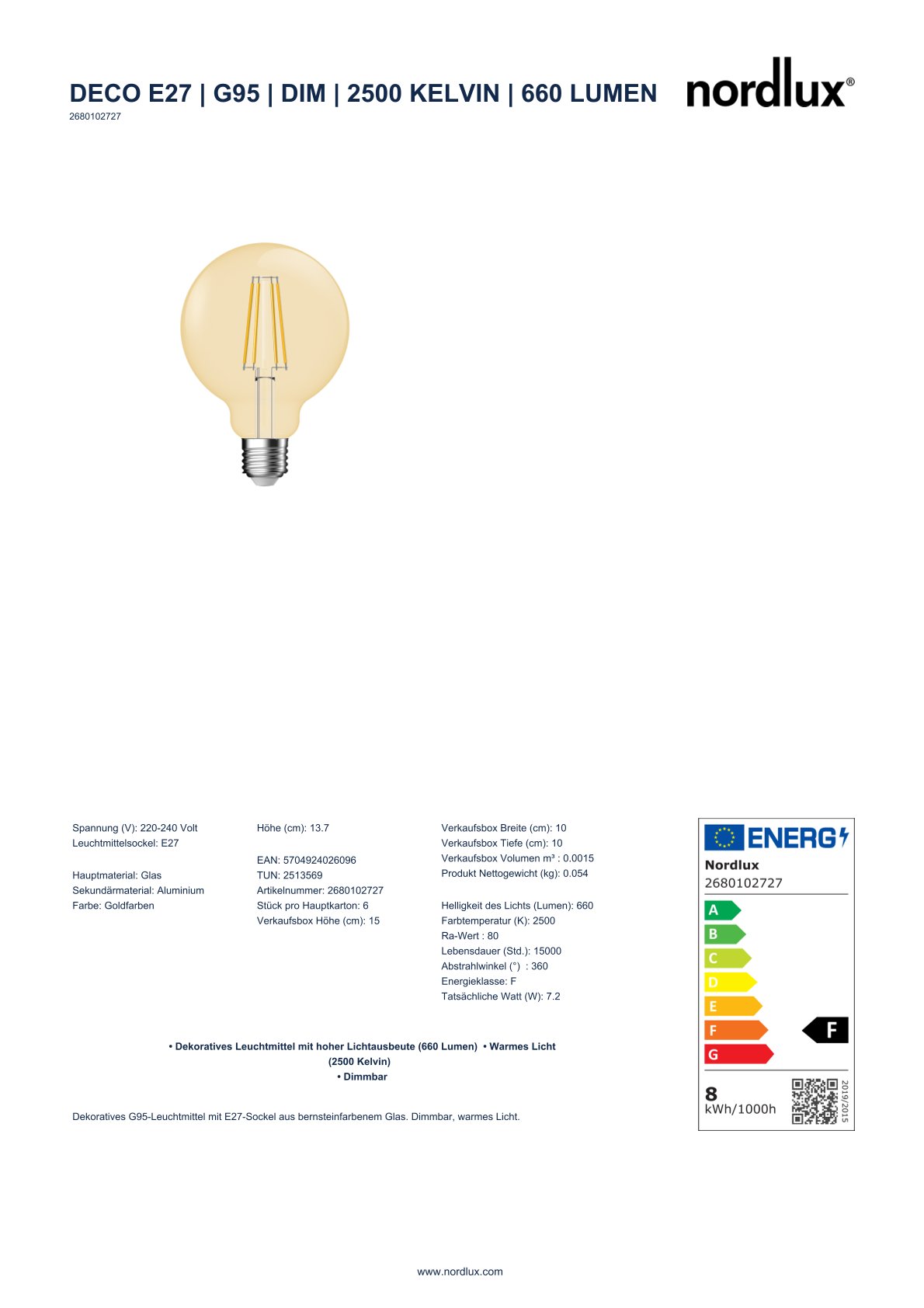 Lieferumfang : 1x Nordlux LED Lampe G95 dimmbar 7,2W E27 2500K 660Lm 2680102727