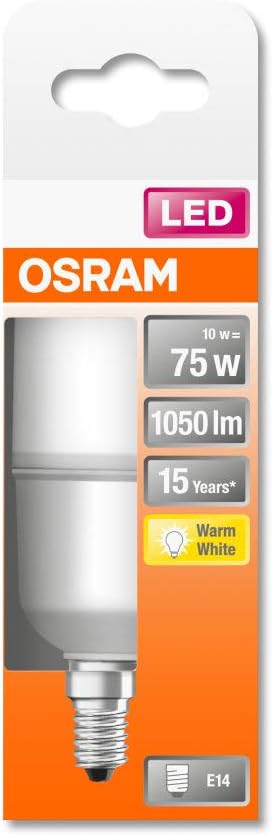 Effiziente kolbenförmige Osram STAR STICK LED Lampe mit E14 Fassung, 200° Abstrahlwinkel und 9W Nennleistung leuchtet mit 1050Lm Lichtstrom in 2700K warmweiss.