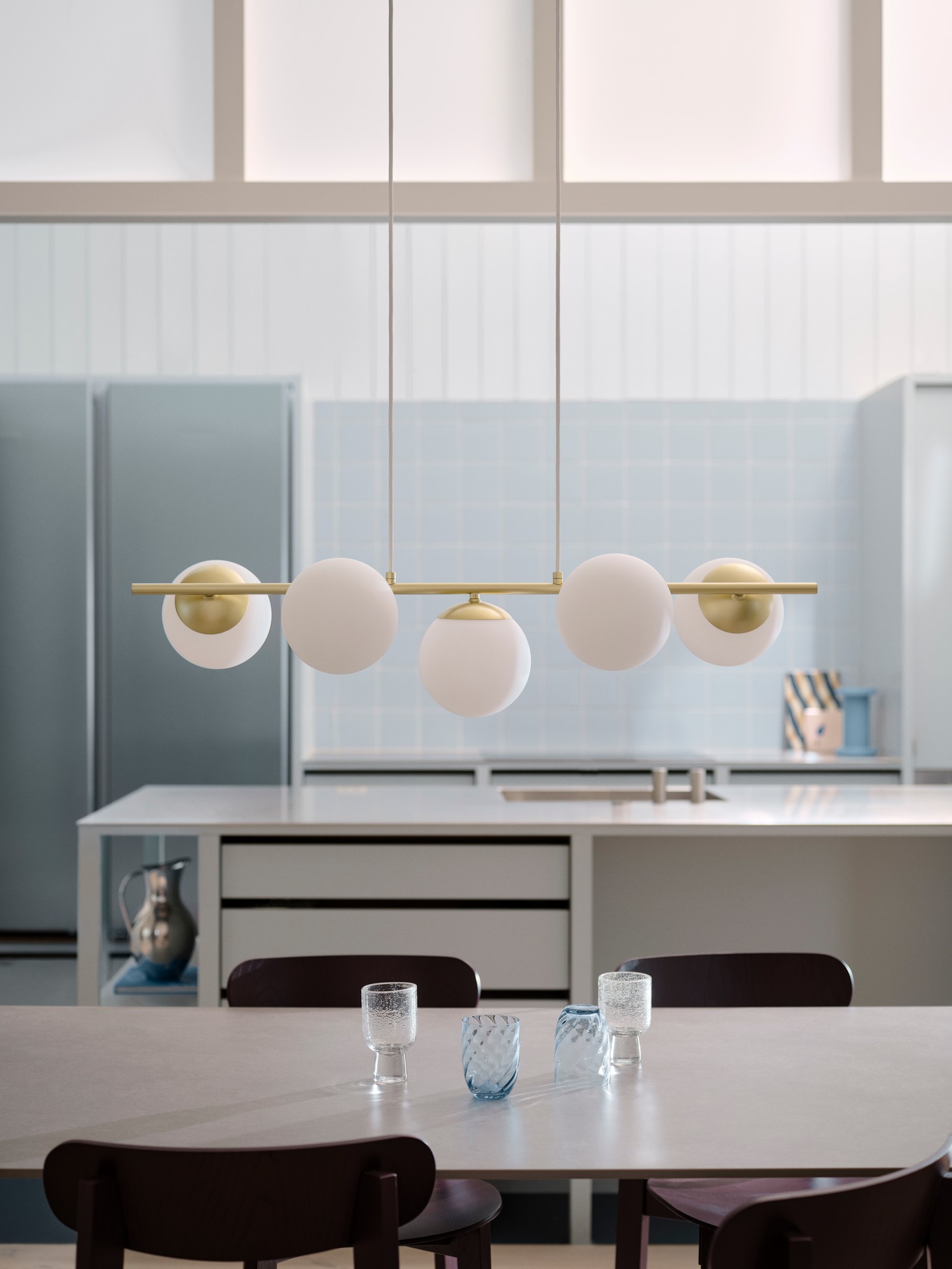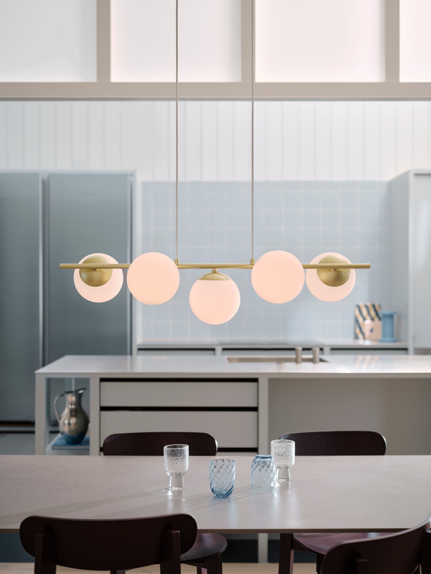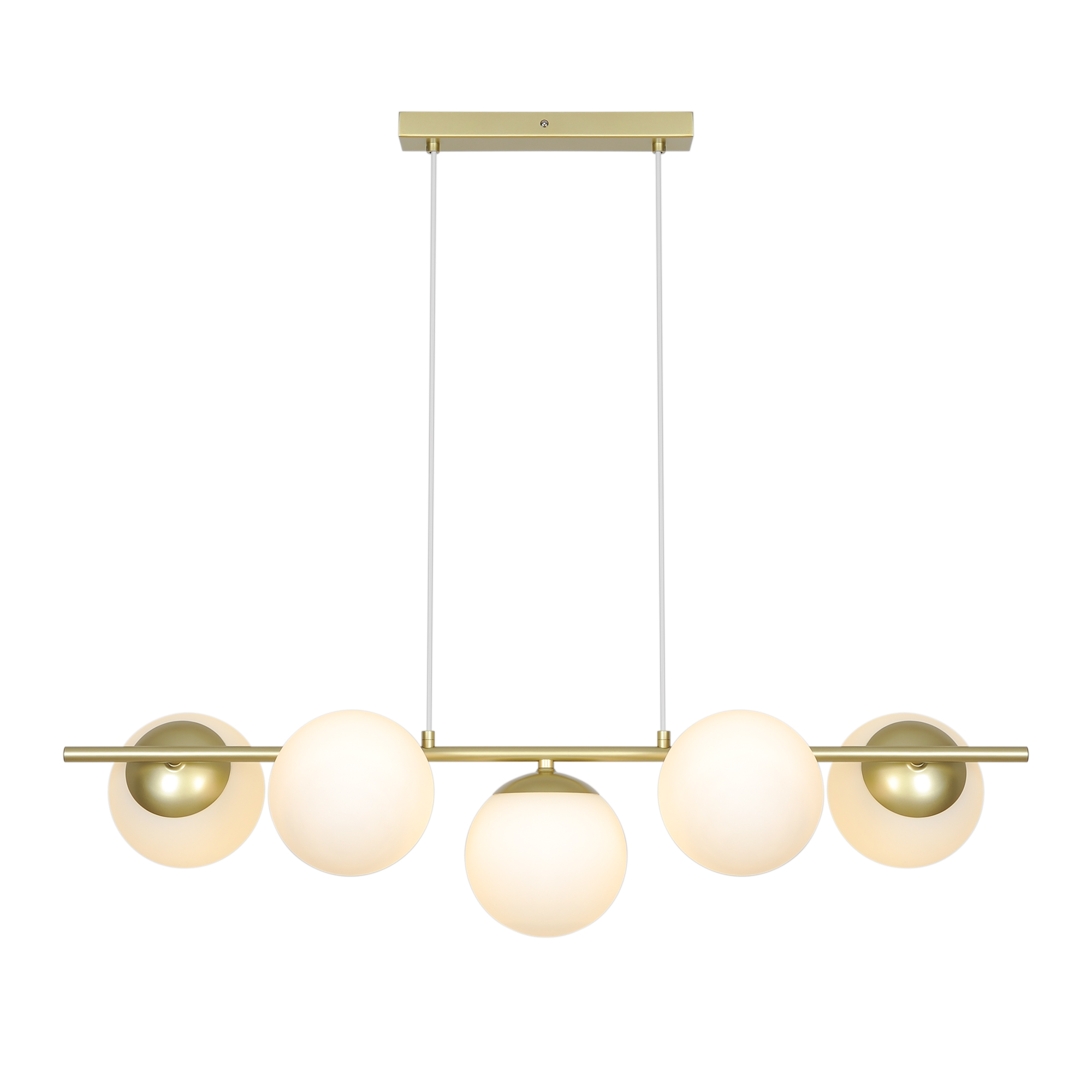 Glamouröse Pendelleuchte Lilly von Nordlux - Pendel mit Opalweißem, mundgeblasenem Glas für 5x E14 Fassungen. Diese moderne Hängelampe in Messing ist zugleich schlicht und elegant.