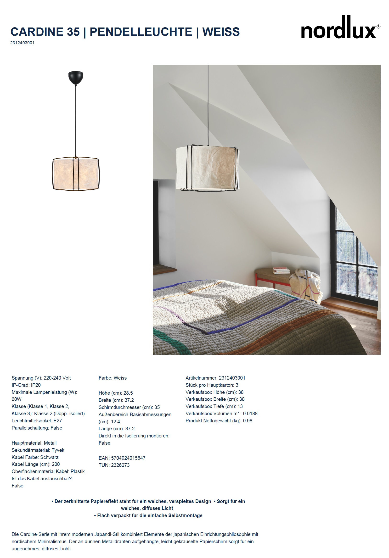 Zerknitterte Papiereffekt sorgt für ein weiches, diffuses Licht - Pendelleuchte Cardine 35 von Nordlux in Farbe weiss aus Tyvek. Pendel 2312403001 ist mit E27 Fassung ohne Fassung.