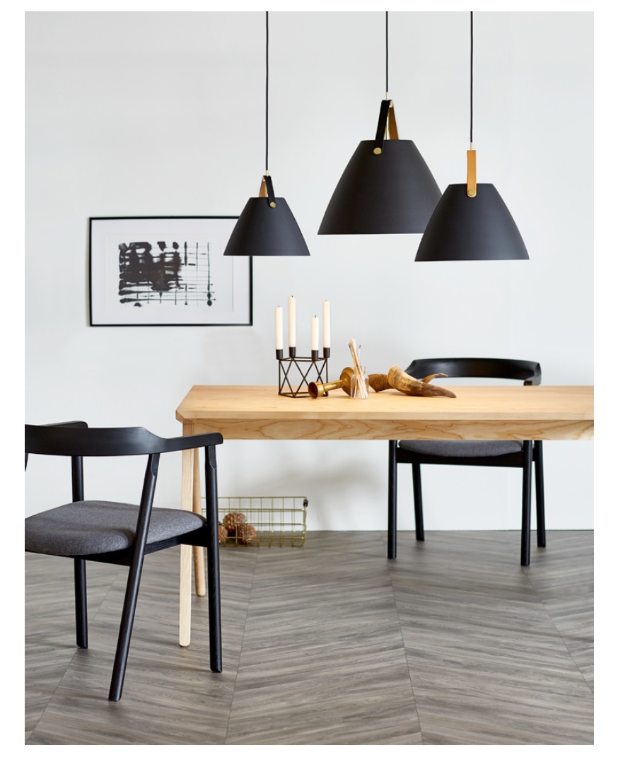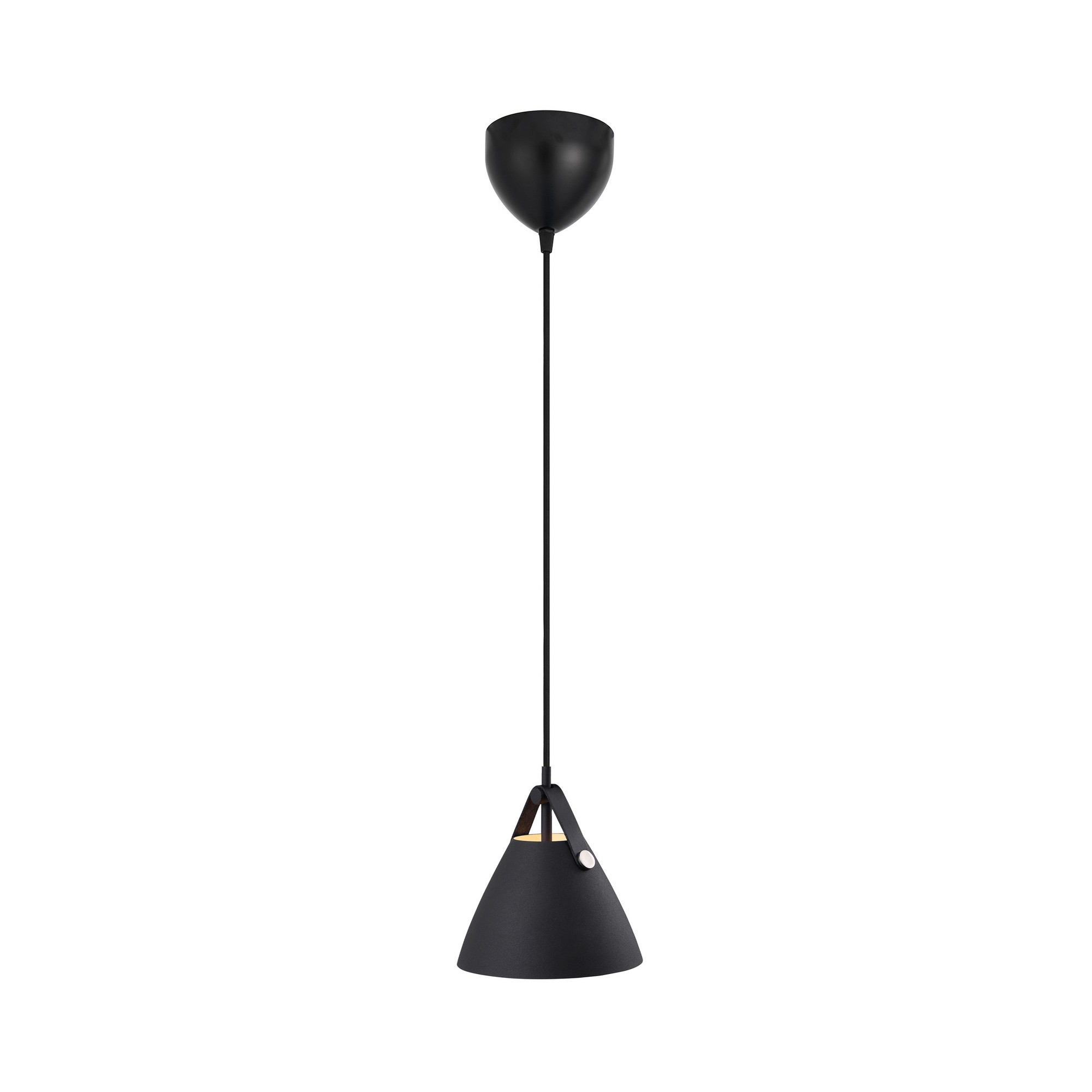 Stilvolle dänische Pendelleuchte Strap 16 mit industriellem Look aus Metall und echtem Leder mit GU Fassung von Nordlux aus der Design for the People / DFTP Serie im skandinavischem Stil und modernem schwarz.
