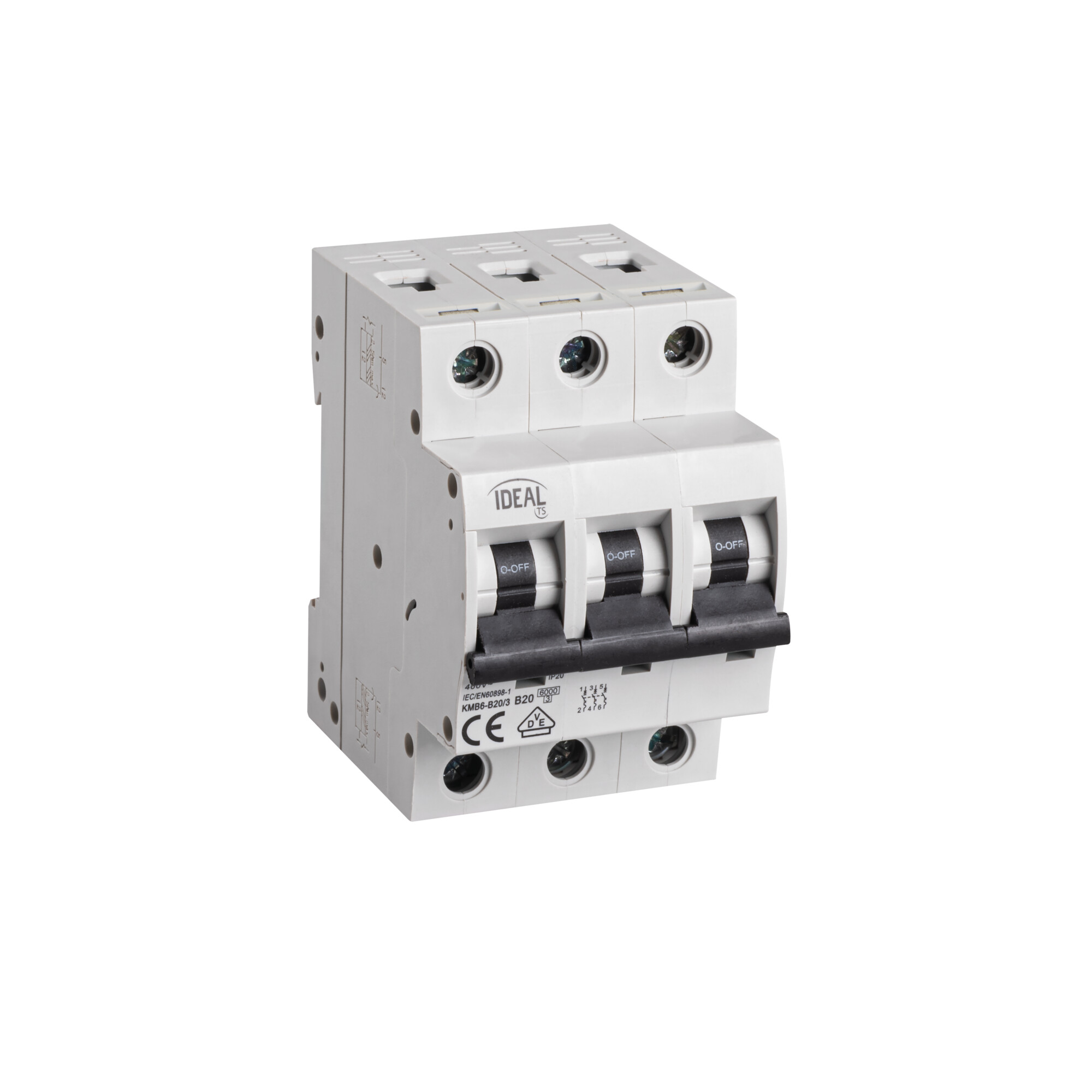Grauer Sicherungsautomat & Sicherung aus der Serie KMB6 B20 3P mit der Leistung 20A von Kanlux ist für den Einbau in Verteiler und Sicherungskasten als Leitungsschutzschalter bestimmt.