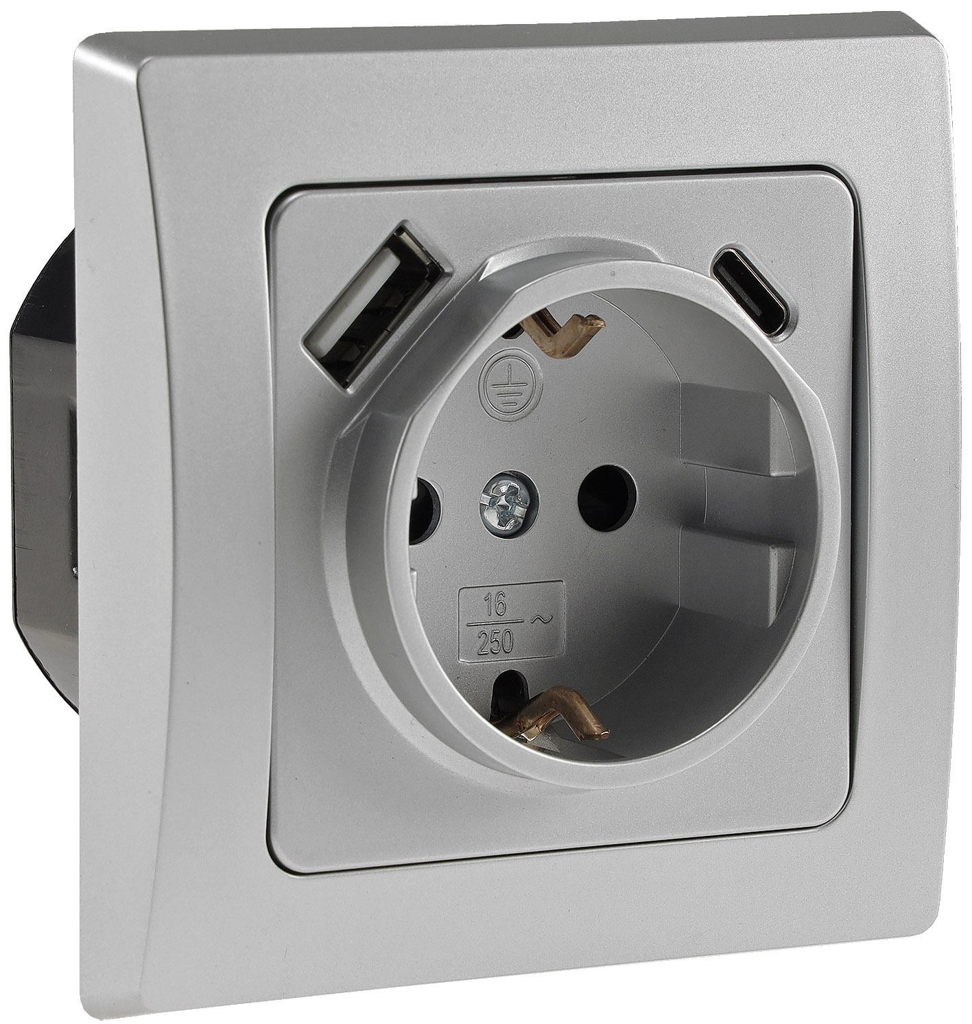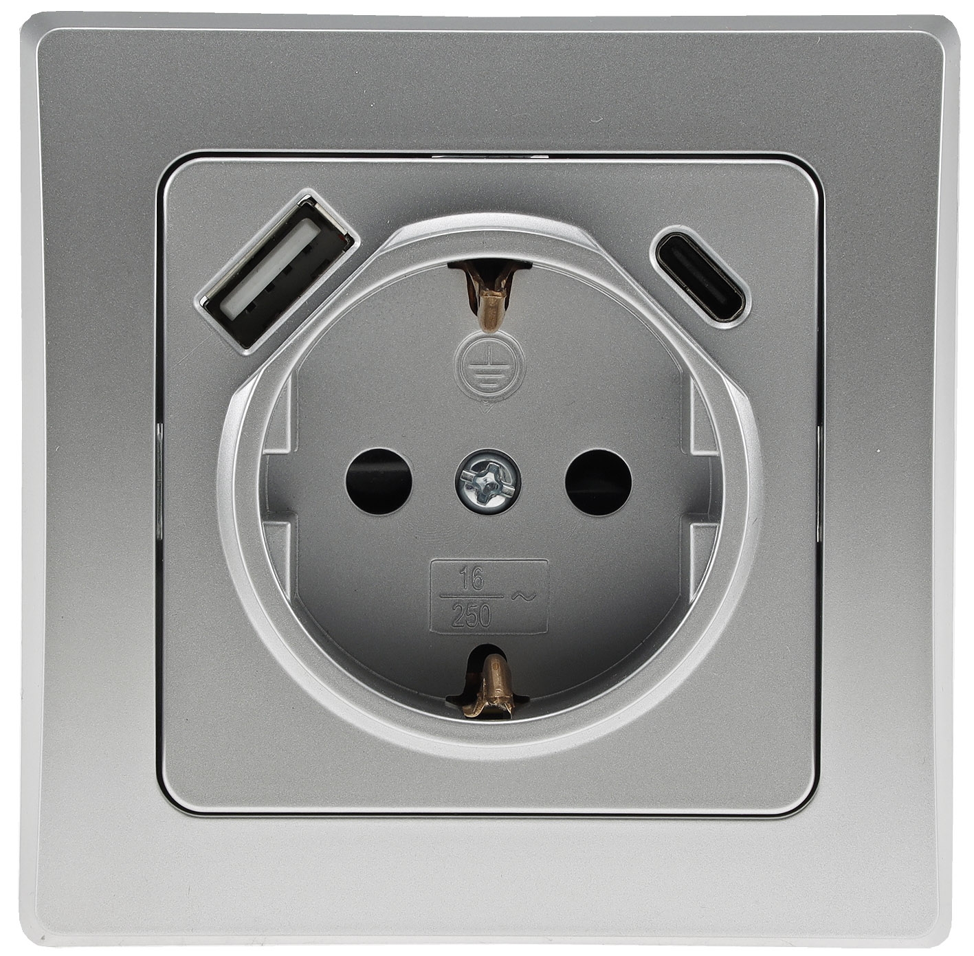 Schutzkontaktsteckdose 23341 aus der Schalterserie DELPHI mit USB A und USB C - Steckdose mit Schutzkontakt, Unterputz Montage, 16A Leisutng, Farbe silber, Rahmen + Einsatz.