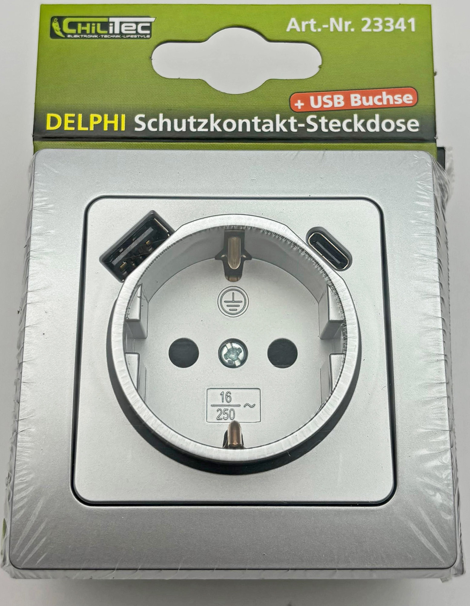 Lieferumfang : 1x 1-fach Steckdose DELPHI mit USB A+C, silber