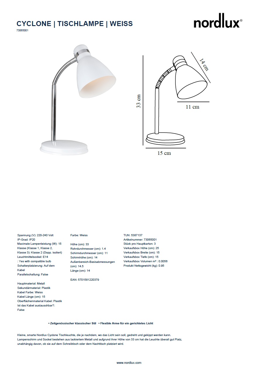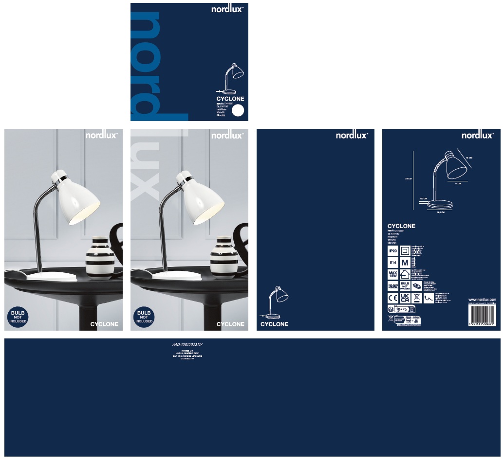 Lieferumfang : 1x Tischleuchte Cyclone, weiss, ohne Leuchtmittel. Bitte bestellen Sie sich eine passende E14 LED-Lampe direkt mit.