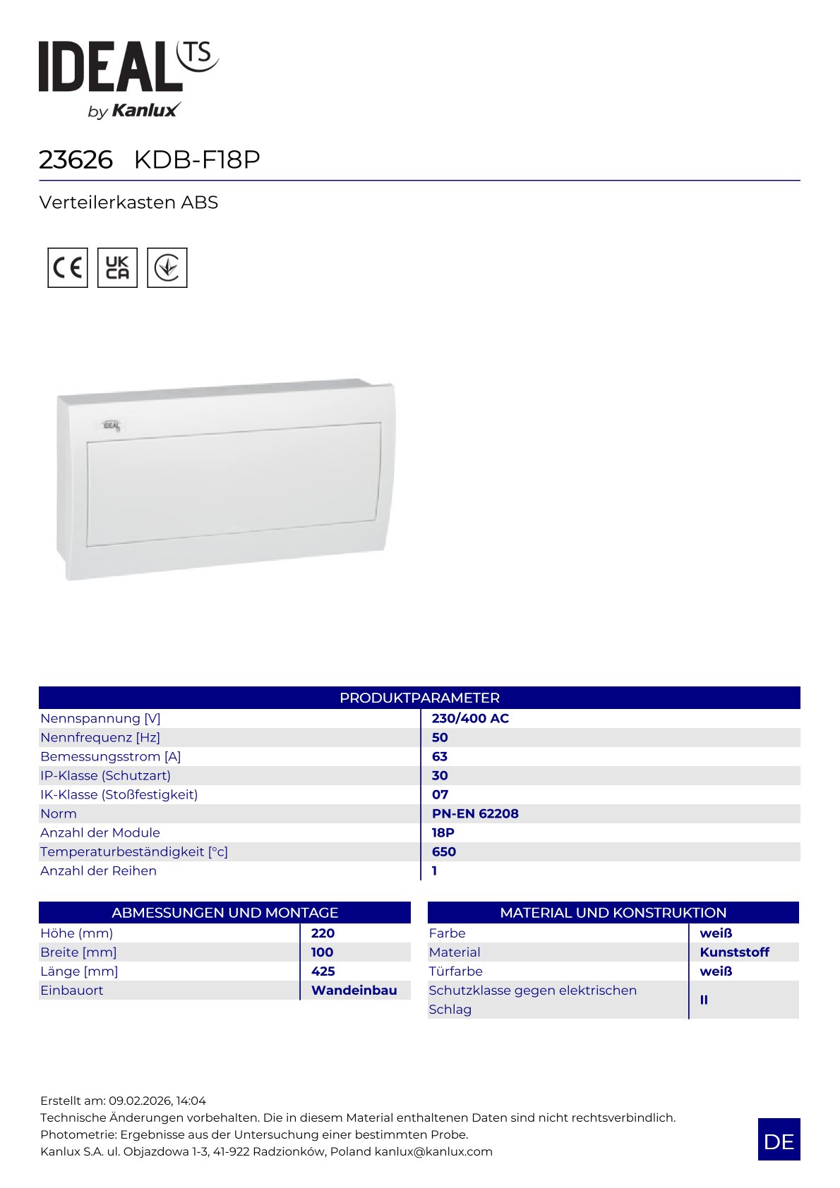Verteiler Unterputz ABS KDB KDB-F18P 1-reihig 18 Module Sicherungskasten 23626