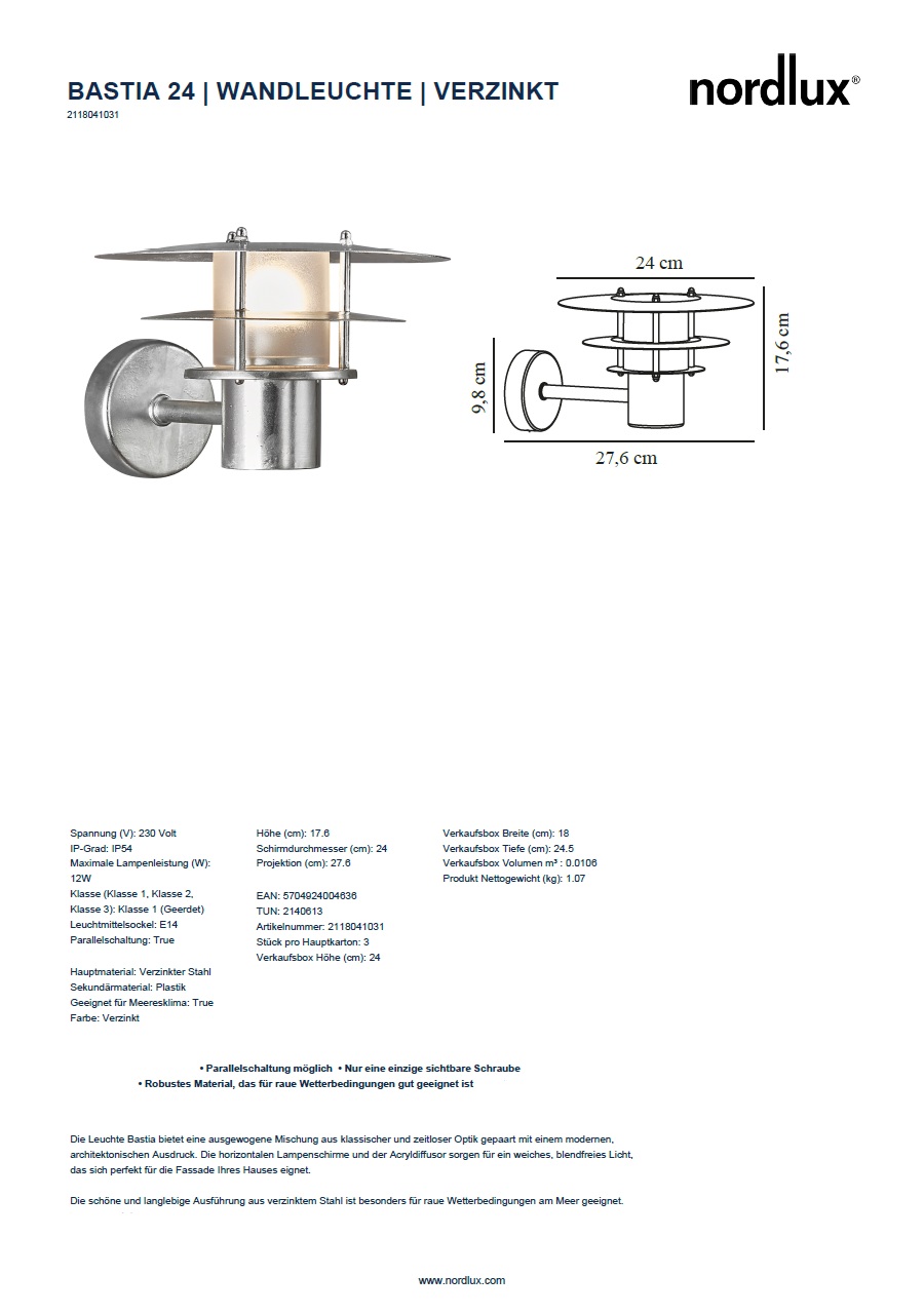 Lieferumfang : 1x Wandleuchte Bastia 24, verzinkt, ohne Leuchtmittel.