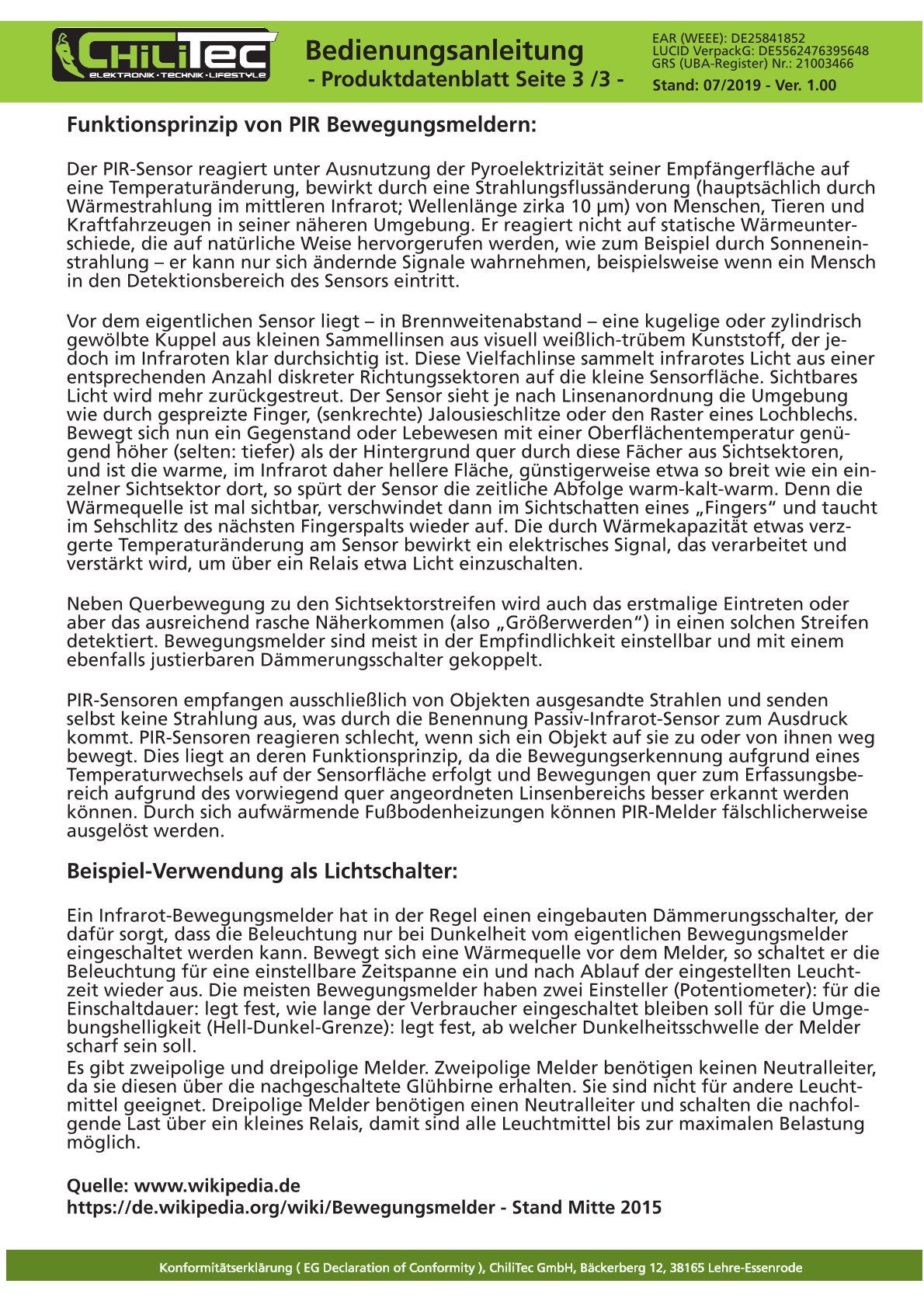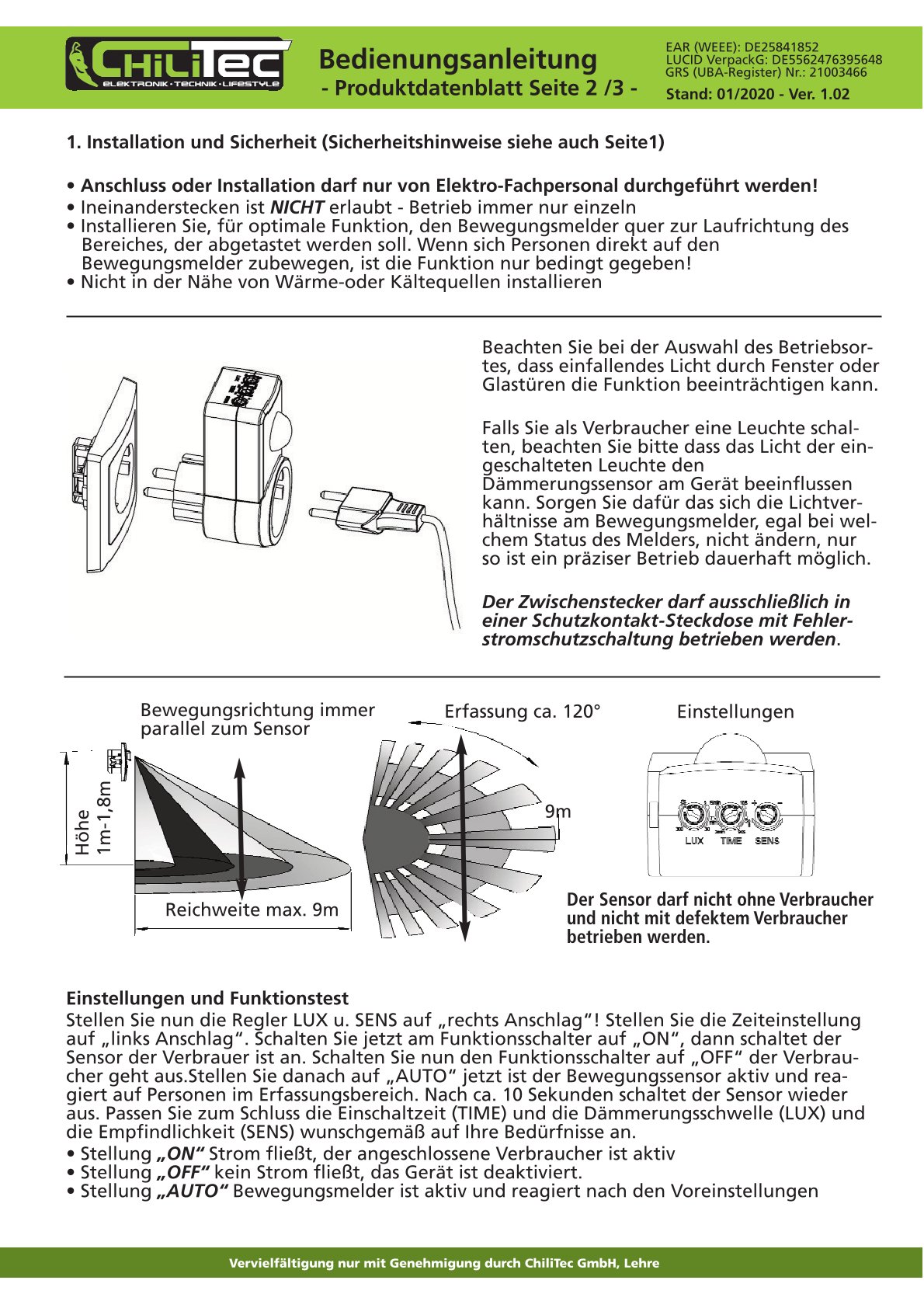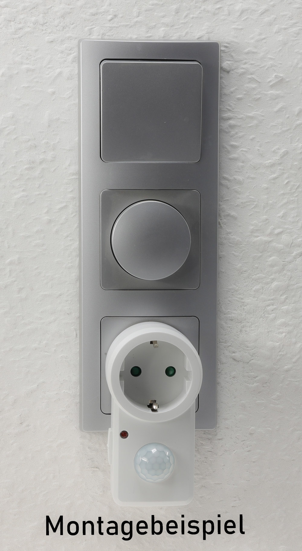 Zwischenstecker von ChiliTec mit Bewegungsmelder mit integriertem PIR-Sensor, LED geeignet, Erfassungswinkel 120°, bis zu 9m Reichweite, 230V Nennleistung 1200W, Korpusfarbe weiß schaltet automatisch bei Bewegung ein.